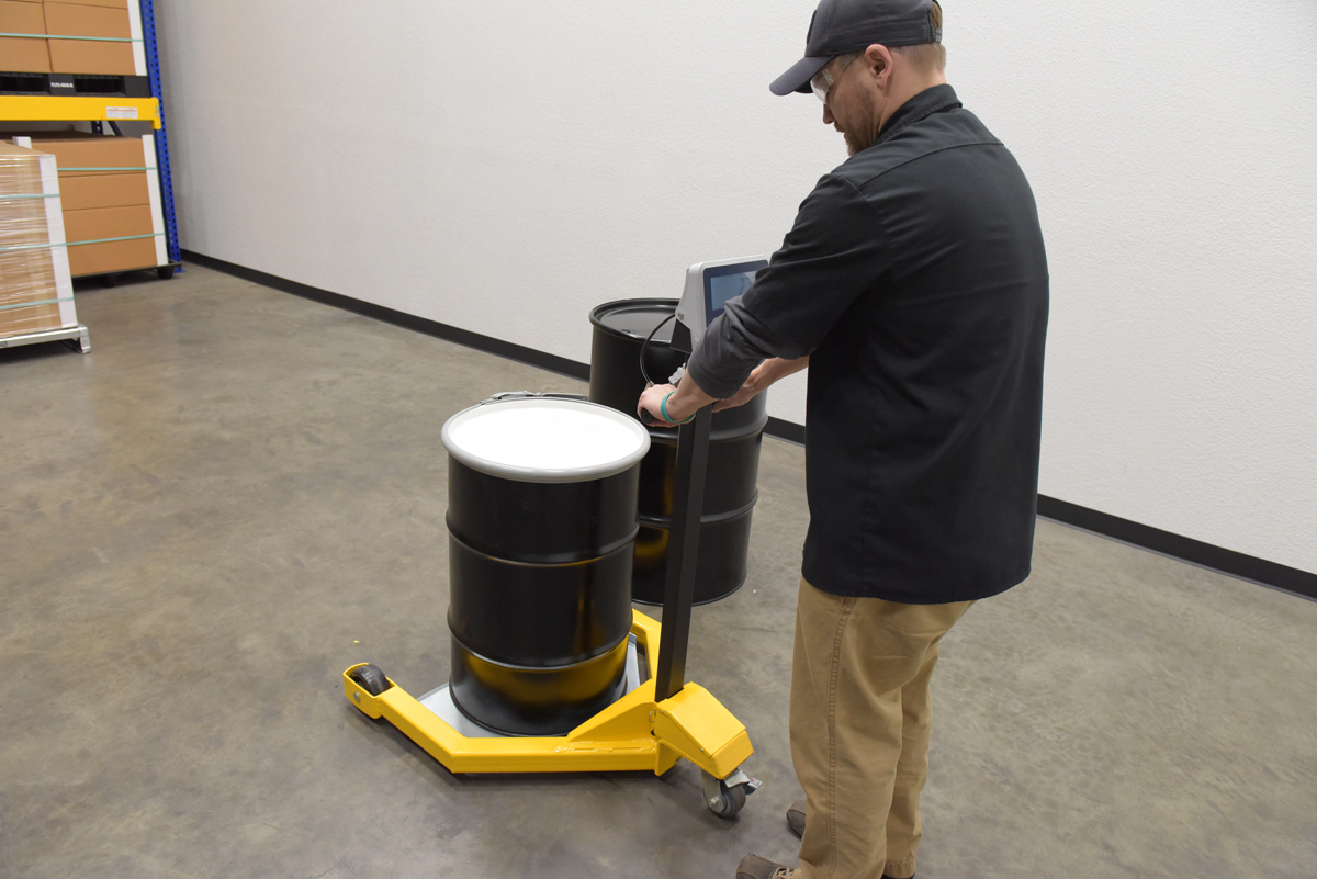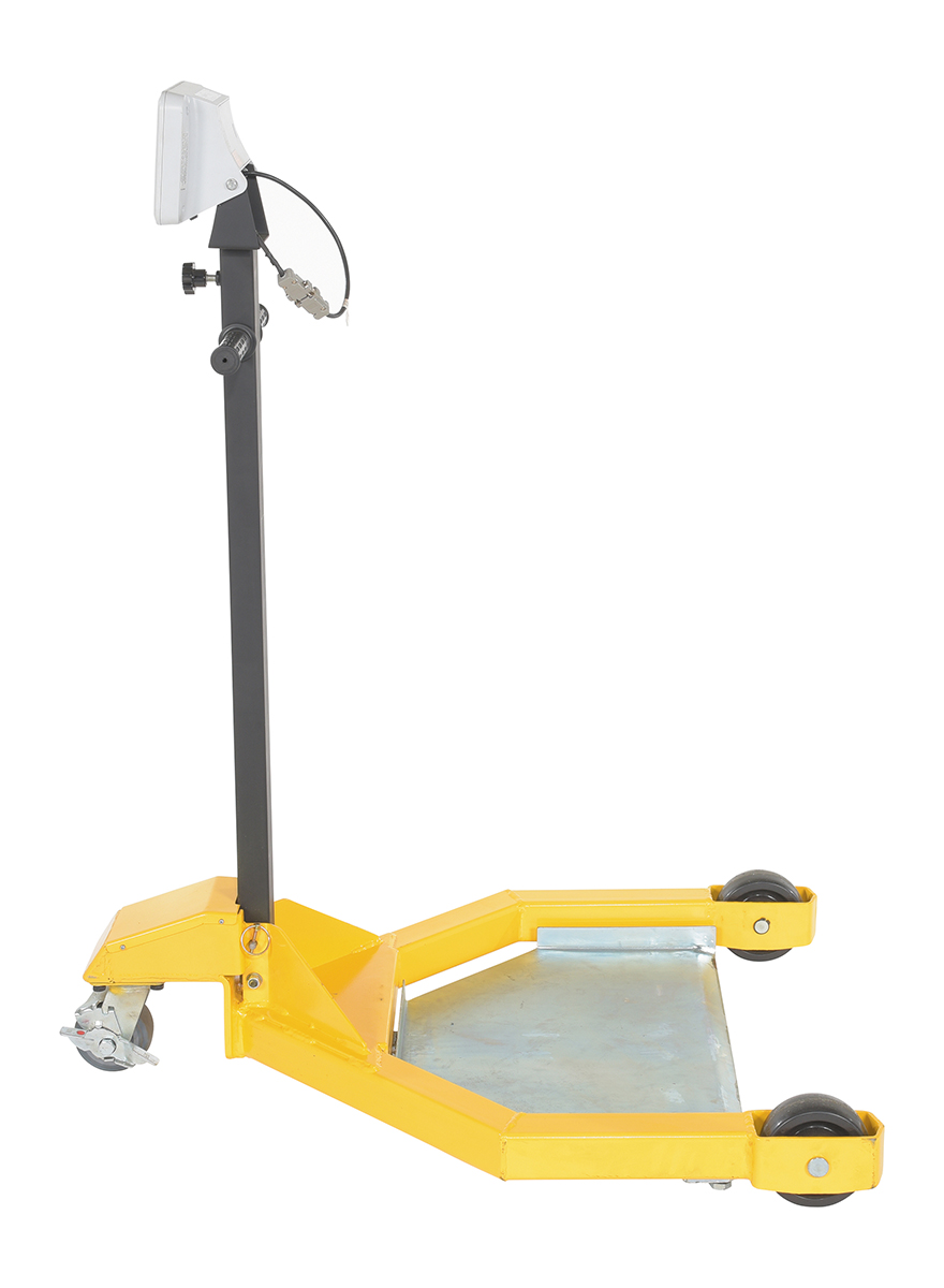 Why bother taking the time to weigh drums at a designated location when you can do it on the go. The low profile drum scale allows the user to weigh the drums while they are being transported. Simply maneuver the drum onto the platform and a read-out of the weight will appear on the screen located near the handle of the dolly. Powder coated black and yellow for increased toughness during daily use. Poly casters are included for simple and a smooth rolling across a variety of surfaces. When not in use, the handle folds down onto the loading platform for a simple storage.