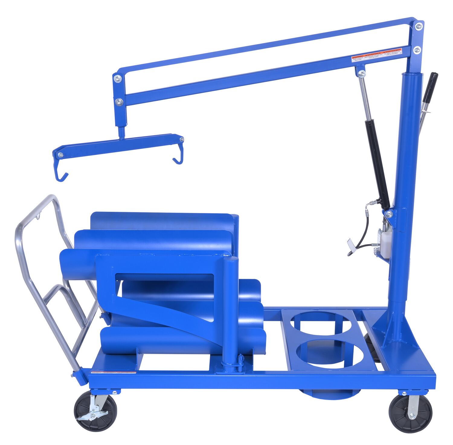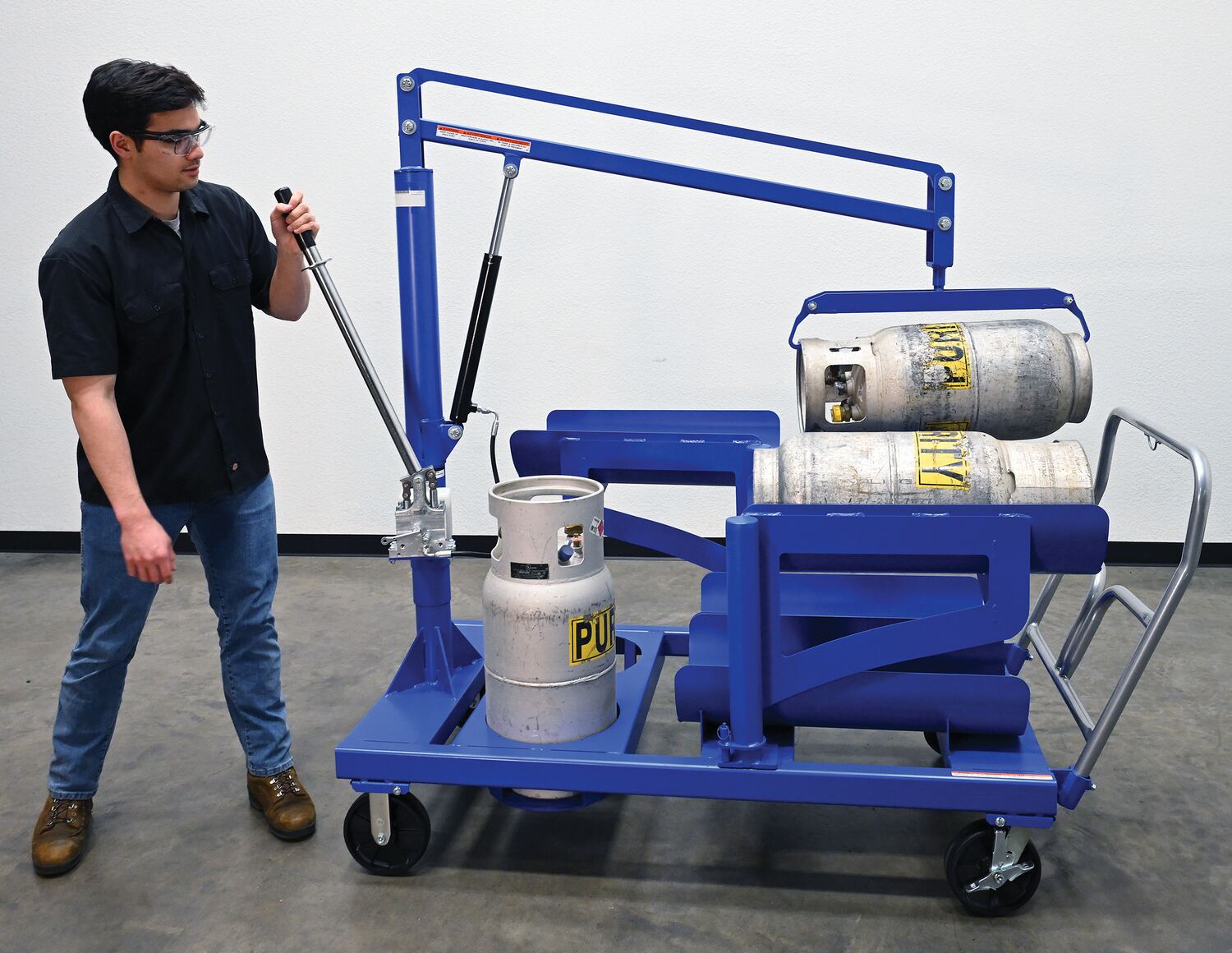 Steel LP Tank Truck 136-7/16 In. x 33-13/16 In. x 94-9/16 In. 6 Tank Capacity BlueFinally an easy answer to lifting, storing, and transporting problems associated with LP tanks. This all-in-one LP tank truck allows users to transport LP tanks where needed. The built-in crane can be used to safely load full tanks into fork trucks. The crane pivots for maximum versatility. The crane boom is raised and lowered with a manual hand pump hydraulic lift. The tank attachment at the end of the boom automatically clamps to each end of the cylinder. The built-in racks are ideal for LP tank storage-racks. Store two (2) tanks in the vertical position and four (4) tanks in the horizontal position. Truck includes a push handle with casters for portability.