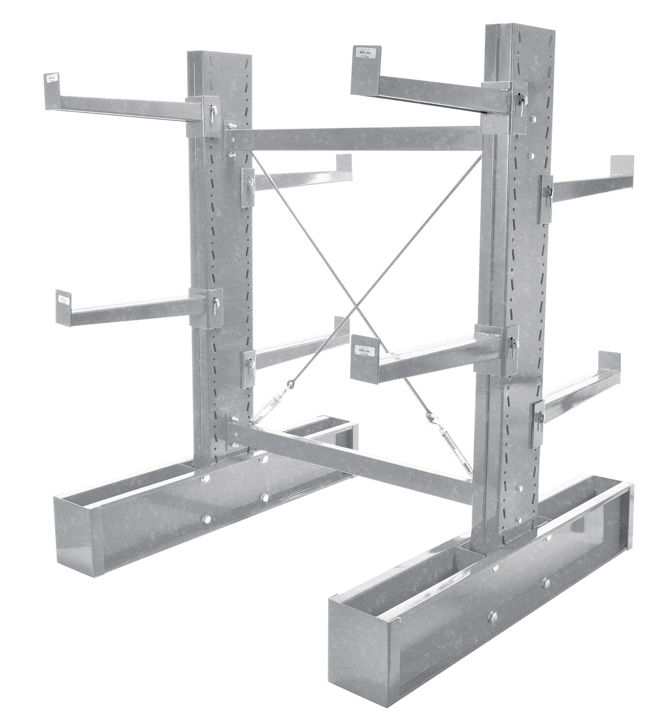 Galvanized Medium Duty Double Sided Cantilever Rack Kit 24 In. Arms 22,000 Lb. Capacity SilverThe Galvanized Cantilever rack systems are ideal for distributing and industrial settings. The galvanized steel design minimizes rust while providing a strong construction. The adjustable rack arms can be adapted to a customized position allowing the unit to fit the needs of individual circumstances.