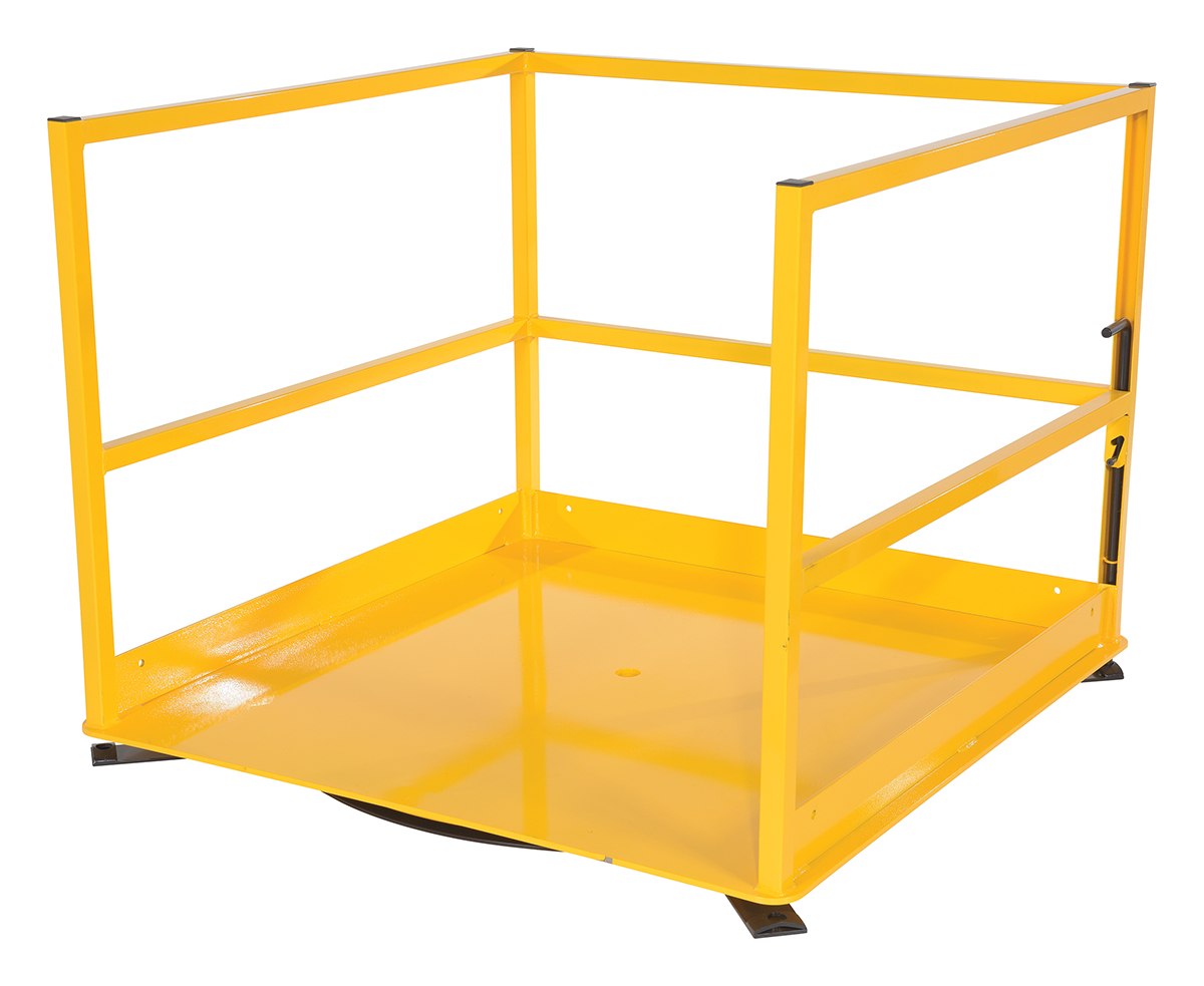 Steel Rotating Mezzanine Safety Gate System 53 In. x 53 In. x 42-3/16 In. 5,000 Lb. Capacity YellowSafety has always been the number one priority of the rotating mezzanine system. The rotational design can be maneuvered into different positions with minimal manual labor, simplifying the loading unloading process. The mezzanine system includes three gated sides and one open side, ensuring security and stability of both personnel and items. The single open mezzanine side enables pallets and boxes to be transferred safely and efficiently. An extended height, raised lip, on the three gated sides limit possible slide-offs of any small items. Unit includes a yellow and black powder coat finish for baked in added toughness.