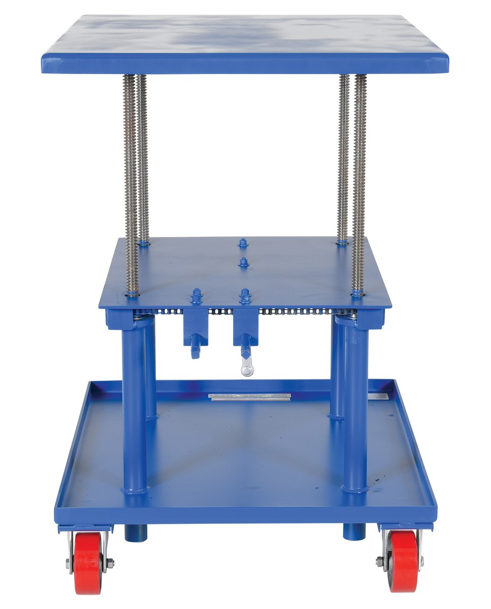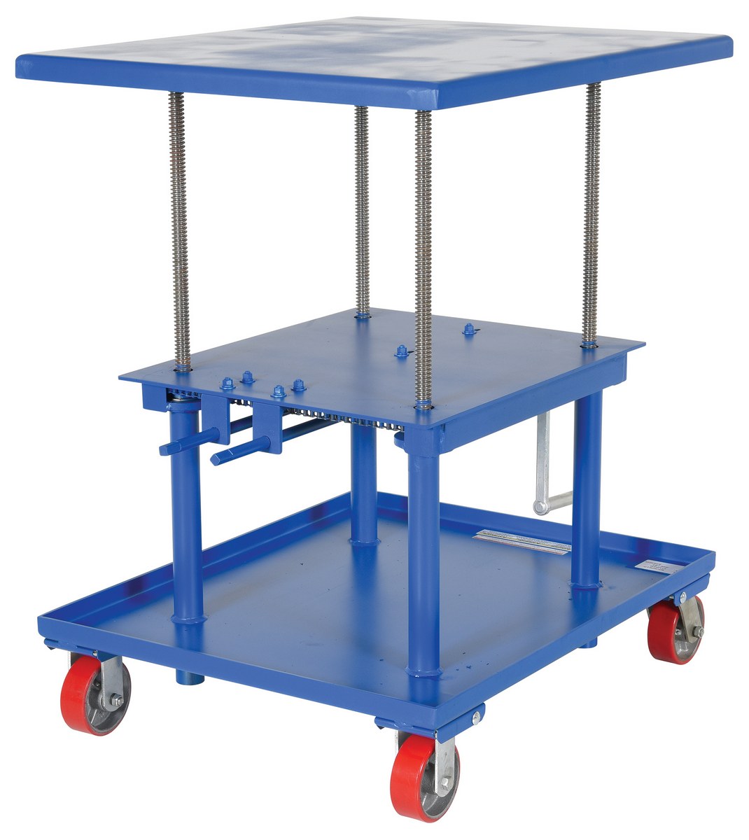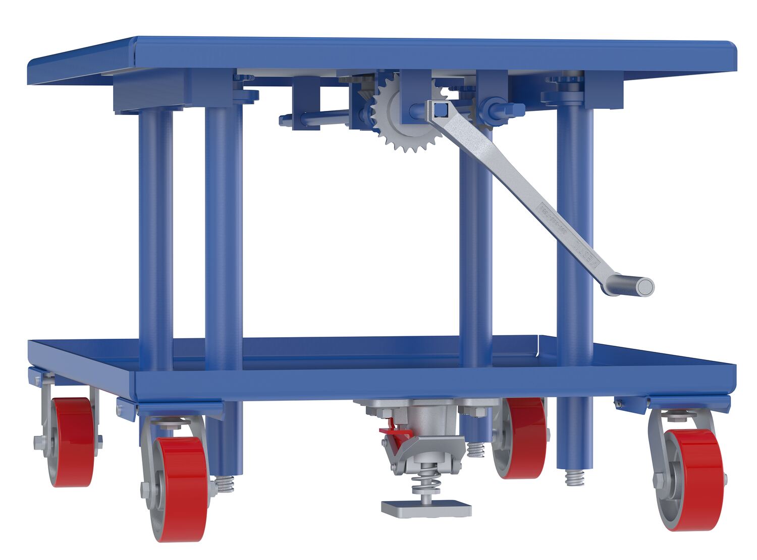 The mechanical post table is an adjustable portable table that is well suited for a wide variety of material handling applications. It moves smoothly on two rigid and two swivel poly-on-steel casters. Includes bolted on adjustable floor lock. Provides positive height adjustment without a downward shift. It features a two-speed manual gear mechanism to move heavy loads.