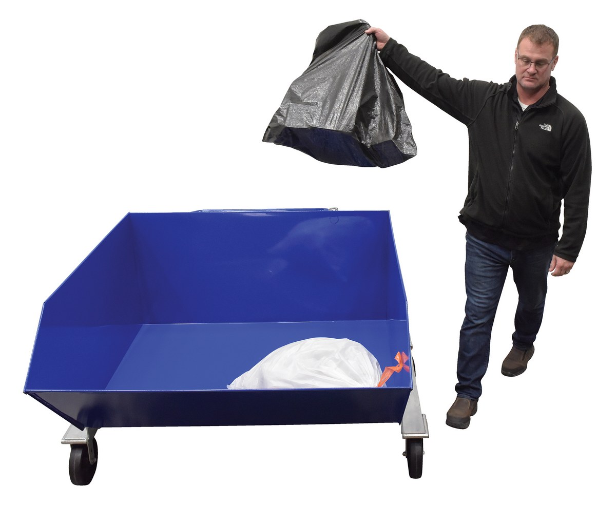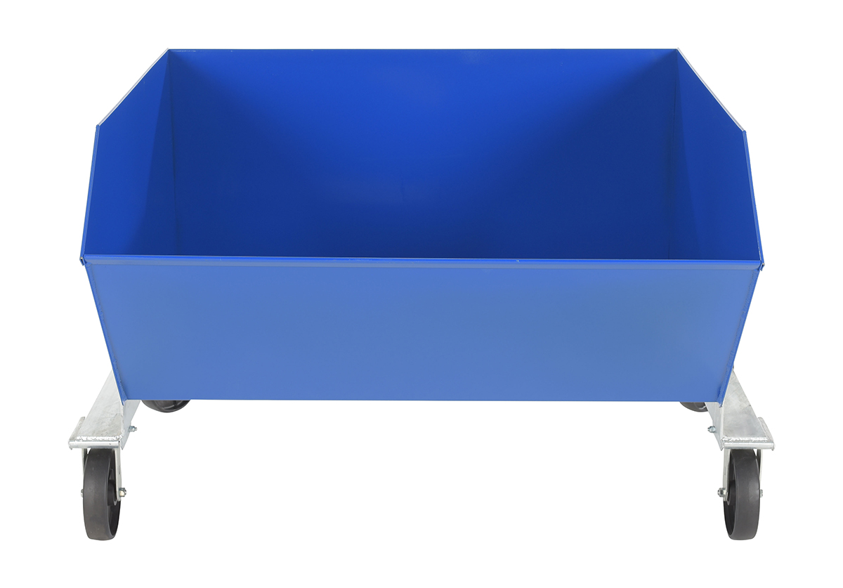 A portable steel Hopper makes handling waste and bulk material safer and more convenient. Fork truck entry openings are designed to move hopper over rough terrain. Foot operated caster lock is included. Unit tilts with assistance from operator while seated on fork truck. Handle for transporting. The included safety restraint should be properly secured to a fork truck before dumping. Welded construction makes them durable. Blue baked-in powder-coated toughness with galvanized base.