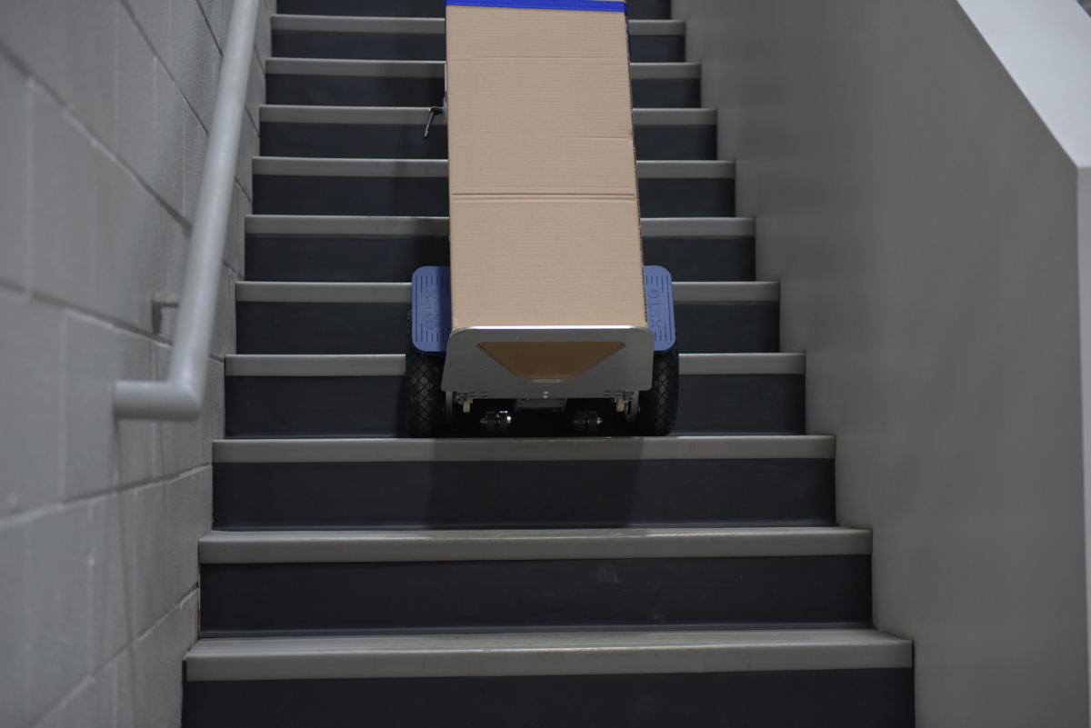 When objects are required to be moved up or down flights of stairs, the powered stair climber is the perfect asset. With the large ergonomic handle and tall upright aluminum alloy structure, a single user can transport goods with ease. A wide platform base gives the user the opportunity to transfer a variety of items whether they are heavy, light, large or small. When transferring goods down a set if stairs, the brake is automatically applied to ensure safety and consistent speed of movement. The powered design increases user safety and minimizes the labor associated with moving awkward items. This powered stair climber has two raise/lowering speeds. When not in use, the cart folds into a very compact design that is perfect for transporting in vehicles or storing away in closets. Large polyurethane wheel make traversing over a variety of surfaces as simple as can be.