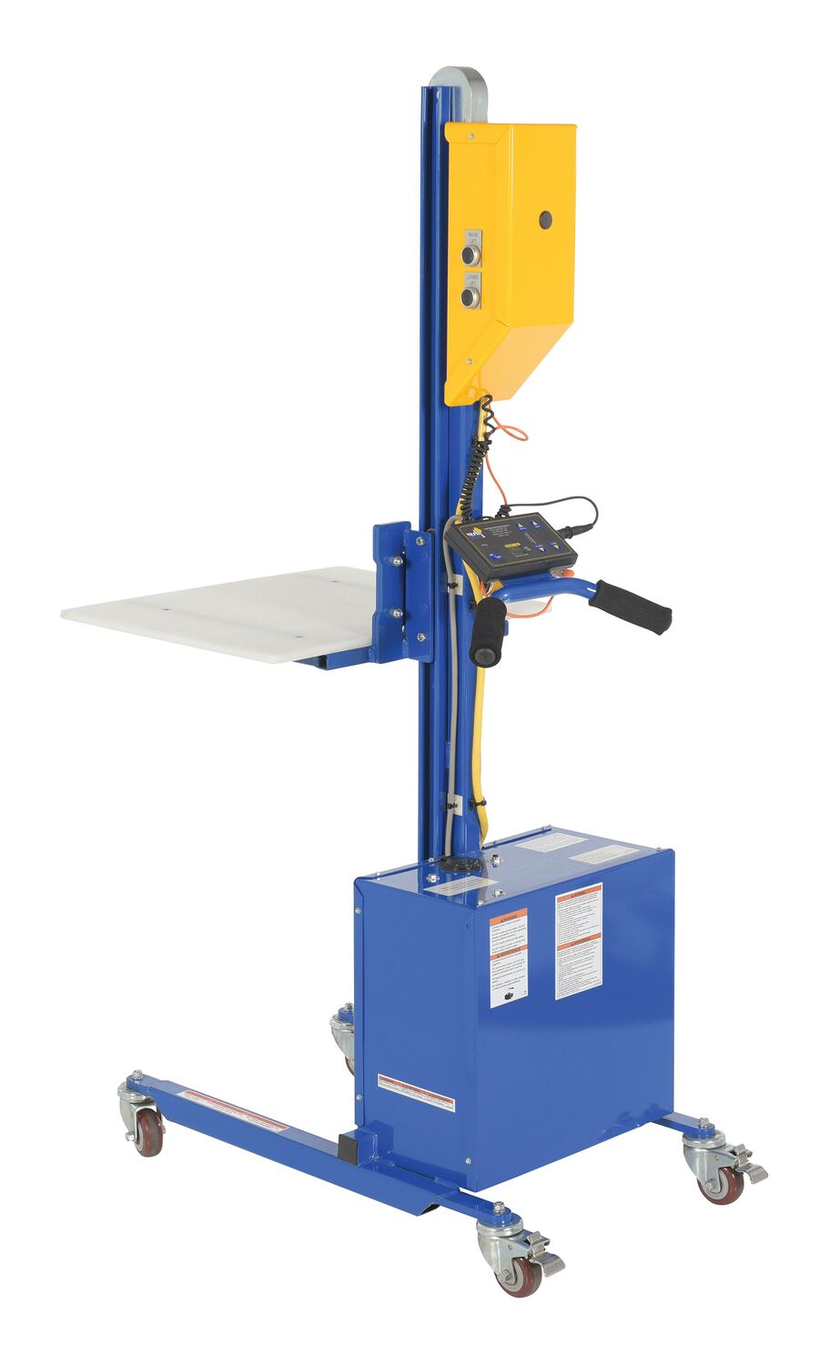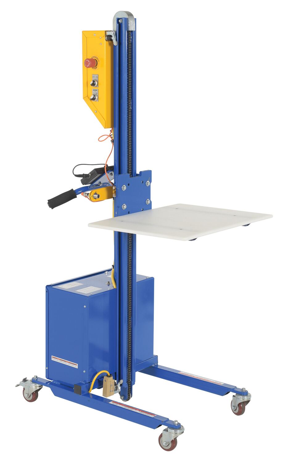 Powered quick lift units transport and position loads quickly and efficiently. Featuring a low profile design with dual push handles for maneuvering in narrow aisles and confined spaces. The auto height indexer lets the platform be unadjusted to the most suitable height. When unloading many boxes, as one box is taken off of the platform, the height of the platform automatically re-adjusts back to the set proper height. This minimizes bending and keeps the user in a more ergonomic position throughout the process. Unit is powder coated for baked in added toughness.
