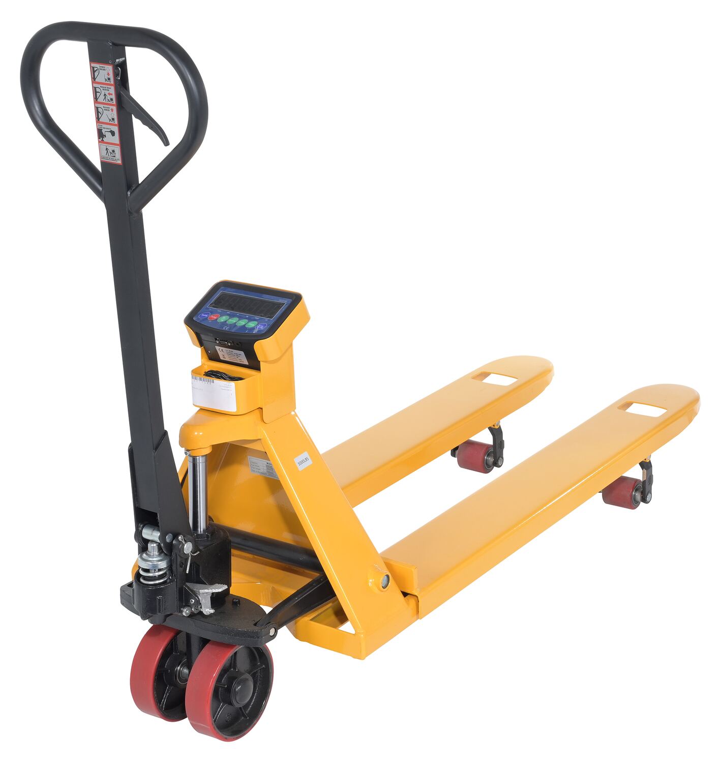 A low profile pallet truck is an economical way for one person to move heavy pallet loads without the use of a fork truck. With a scale included, items can be weighed and moved all in one unit. This brings efficiencies to warehouses and shipping areas, while bypassing the traditional time consuming weigh areas. The casters (two steer and four rollers) give the pallet truck quick movement and smooth turn-ability. The forks are built of steel and are powder coated yellow.