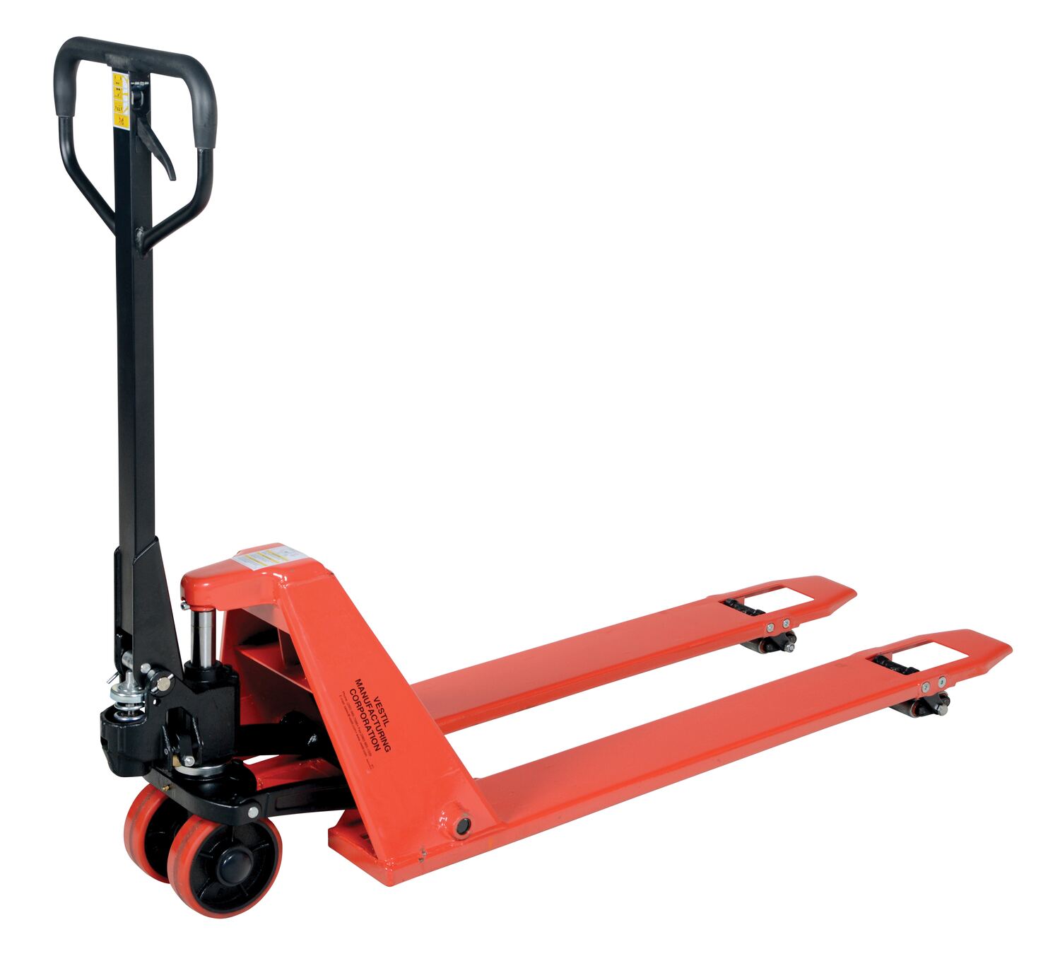 Steel Super Low Pallet Truck 60 In. x 21 In. x 44 In. 2200 Lb. Capacity RedThe super Low Profile pallet truck is ideal for extra low applications. It features a lowered fork height for extra low profile skids, pallets, or machinery. Fingertip lever for raise, lower, and neutral operation. This pallet truck has a powder coat finish and a rubber cushioned handle grip.