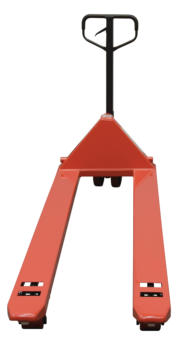 The full featured pallet truck is an economical way for one person to move heavy pallet loads without the use of a fork truck! Includes two (2) articulating steering wheels and two (2) front load rollers. The ergonomic design requires only seventy-five (75) pounds of pulling force when fully loaded. Steering wheels include bearing dust covers for added life. Nose wheels are located on the front edge of each fork to assist in clean pallet entrance and exit. Reinforced triple-formed steel forks provide twice the strength of standard single-formed forks. The unit is equipped with internally mounted solid steel adjustable push rods. The spring loaded handle automatically returns to vertical position when not in use. Hydraulic pump design facilitates easy-access seal replacement. Chrome-plated hydraulic pump piston for long seal life.