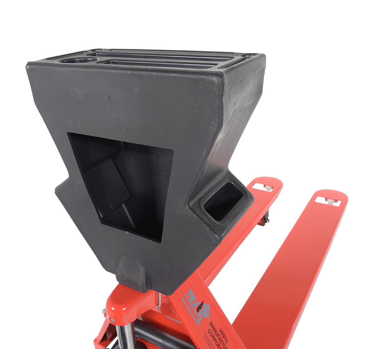 Steel/Plastic Pallet Truck 61-3/16 In. x 20 In. x 48 In. 5500 Lb. Capacity Red with Black P-CaddyA pallet truck with a storage caddy is the perfect bundle of two innovative products. The pallet truck has an ergonomically friendly design with a limited pulling force required, while the caddy allows the user to be more organized and efficient. With a strong powder coated steel construction, the pallet truck moves easily between areas. Nose wheels are located on the front edge of each fork to assist in clean pallet entrance and exit. A molded plastic design allows the caddy to be durable throughout consistent daily use. Installation hardware and instructions included.