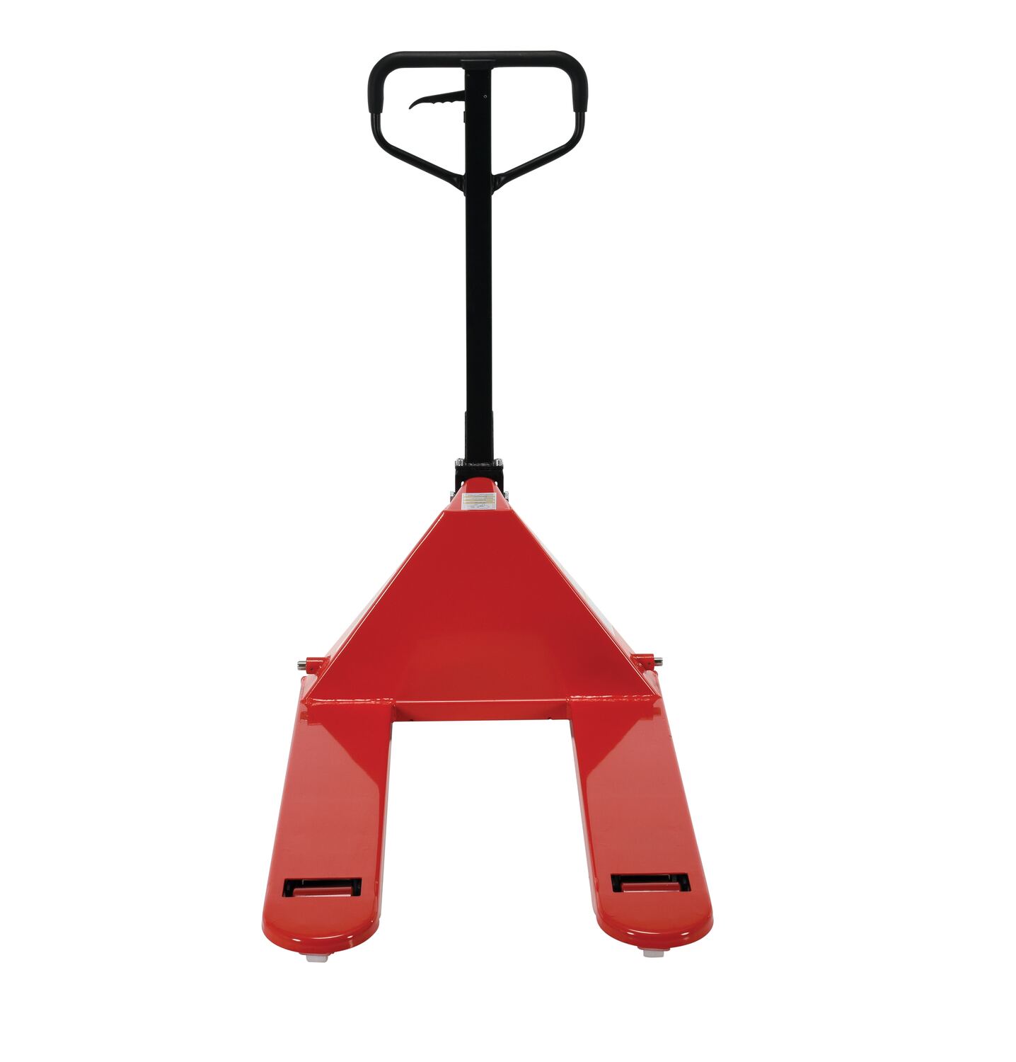 Steel Full Featured Pallet Truck 49-1/2 In. x 27 In. x 48-1/2 In. 5500 Lb. Capacity RedAn economical way for one person to move heavy pallet loads without the use of a fork truck! Includes two articulating steering wheels and two front load rollers. Ergonomic design requires only 75 pounds of pulling force when fully loaded. Steering wheels include bearing dust covers for added life. Nose wheels are located on the front edge of each fork to assist in clean pallet entrance and exit. Reinforced triple-formed steel forks provide twice the strength of standard single-formed forks. Forks are 6." wide each. Equipped with internally mounted solid steel adjustable push rods. Spring loaded handle automatically returns to vertical position when not in use. Hydraulic pump design facilitates easy-access seal replacement. Chrome-plated hydraulic pump piston for long seal life.