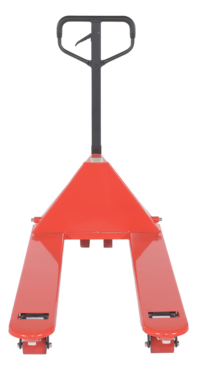 Steel Pallet Truck 61-11/16 In. x 27 In. x 48-5/8 In. 5500 Lb. Capacity RedThe full featured pallet truck is an economical way for one person to move heavy pallet loads without the use of a fork truck! Includes two (2) articulating steering wheels and two (2) front load rollers. The ergonomic design requires only seventy-five (75) pounds of pulling force when fully loaded. Steering wheels include bearing dust covers for added life. Nose wheels are located on the front edge of each fork to assist in clean pallet entrance and exit. Reinforced triple-formed steel forks provide twice the strength of standard single-formed forks. The unit is equipped with internally mounted solid steel adjustable push rods. The spring loaded handle automatically returns to vertical position when not in use. Hydraulic pump design facilitates easy-access seal replacement. Chrome-plated hydraulic pump piston for long seal life.