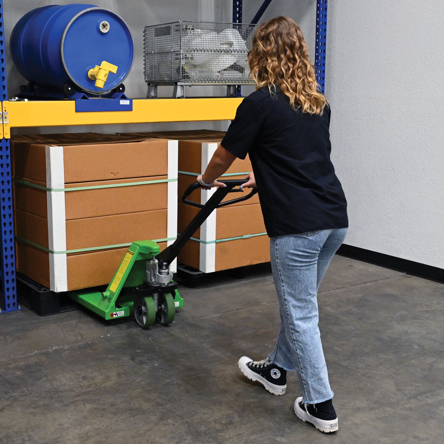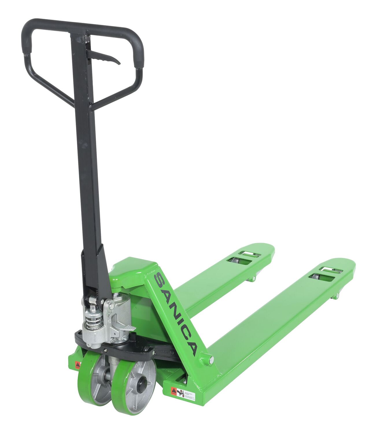 Steel Pegasolift Manual Pallet Truck 21-1/4 In. x 48 In. 5,500 Lb. Capacity GreenThe full featured pallet truck is an economical way for one person to move heavy pallet loads without the use of a fork truck! Includes two (2) articulating steering wheels and two (2) front load rollers. Nose wheels are located on the front edge of each fork to assist in clean pallet entrance and exit. The unit is equipped with internally mounted solid steel adjustable push rods. A chrome-plated hydraulic pump piston supports long seal life, while the hydraulic pump design facilitates simple seal replacement when needed.