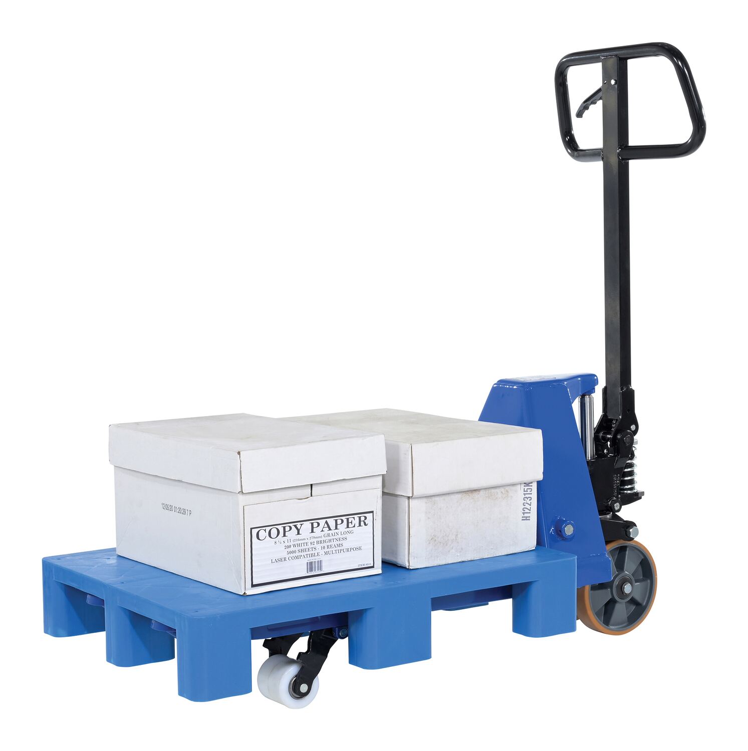 Steel Pramac Mini Hand Pallet Truck Hand Pump 46 In. x 15-3/4 In. x 46 In. 5500 Lb. Capacity Blue/BlackThe mini hand pallet truck is ideal for shipping and dock personnel. The pallet truck is designed of steel for resistance against damage throughout day to day use. A bright finish allows the units to be visible to other personnel, both near and far. The extended steering handle creates a more ergonomically friendly position while distributing products from work area to work area.