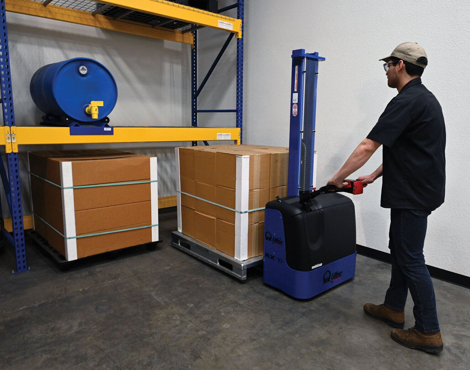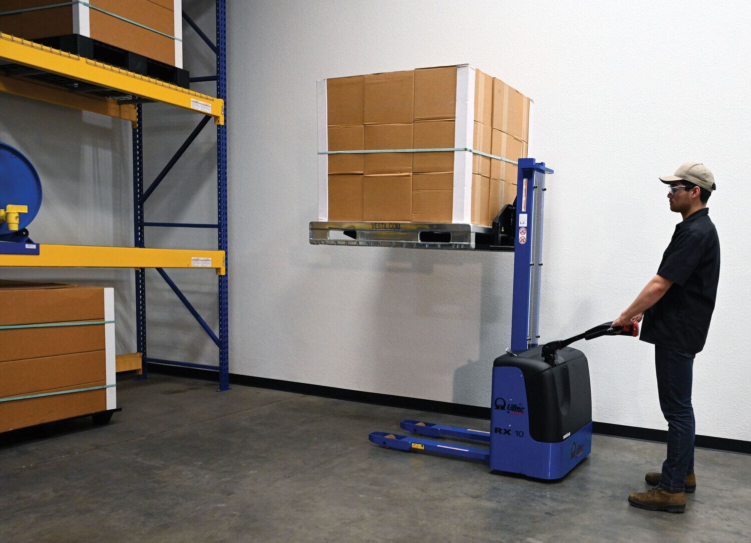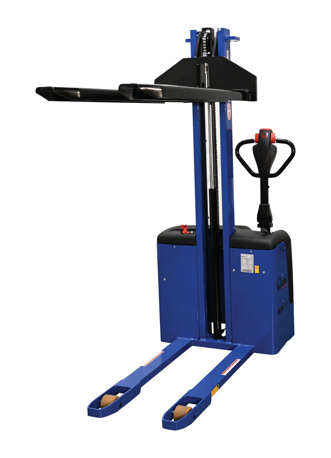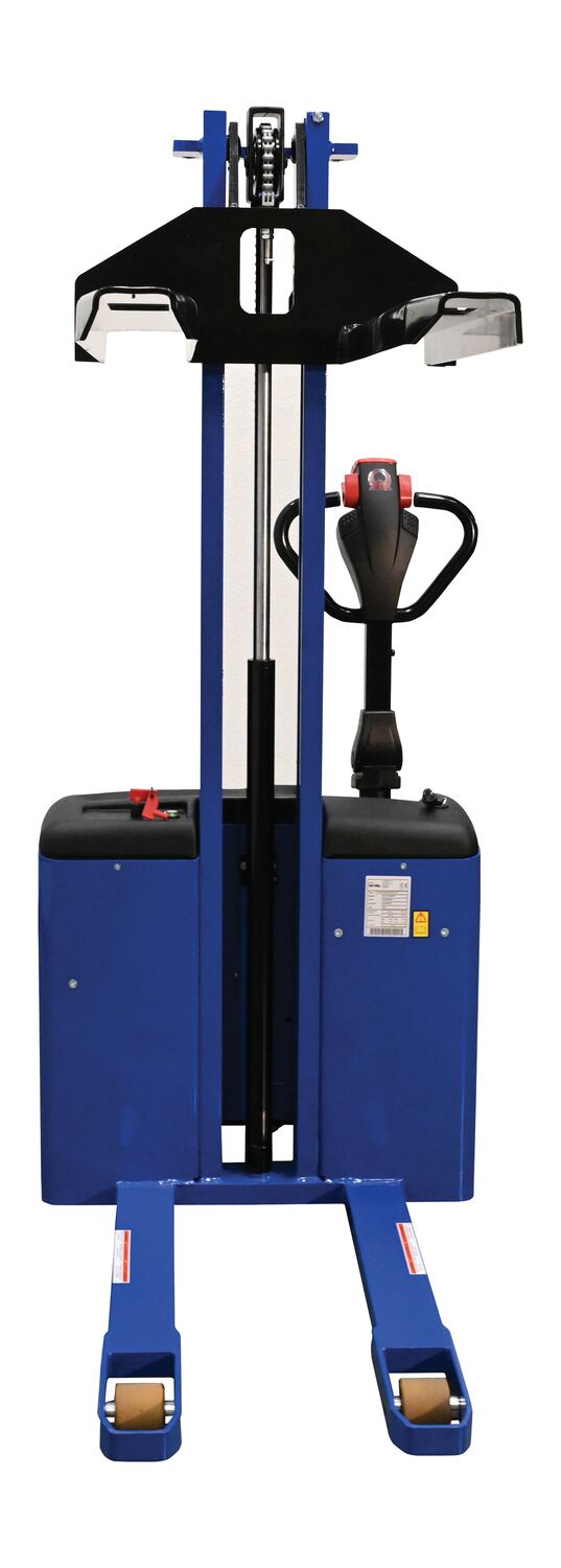 Steel Pramac DC Powered Narrow Mast Stacker Fixed Forks 67 In. x 31 In. x 73-1/2 In. 2200 Lb. Capacity Blue / BlackElectric power drive and lift. Ergonomic handle with a full control and safety system. Features "tortoise" push button for slow motion, a safety punch button with warning buzzer, and on-board battery charger. DC powered with two (2) 12V batteries.