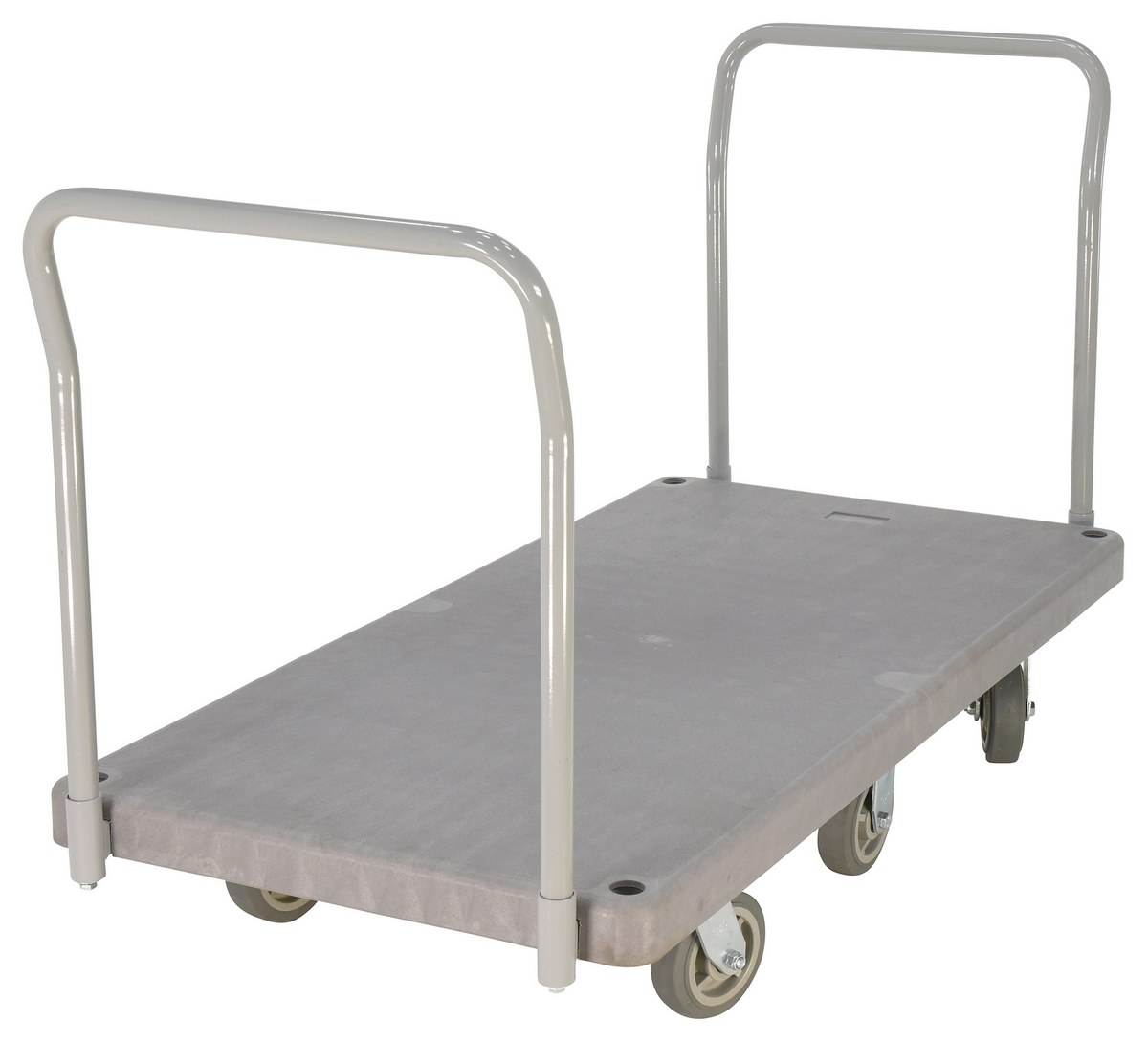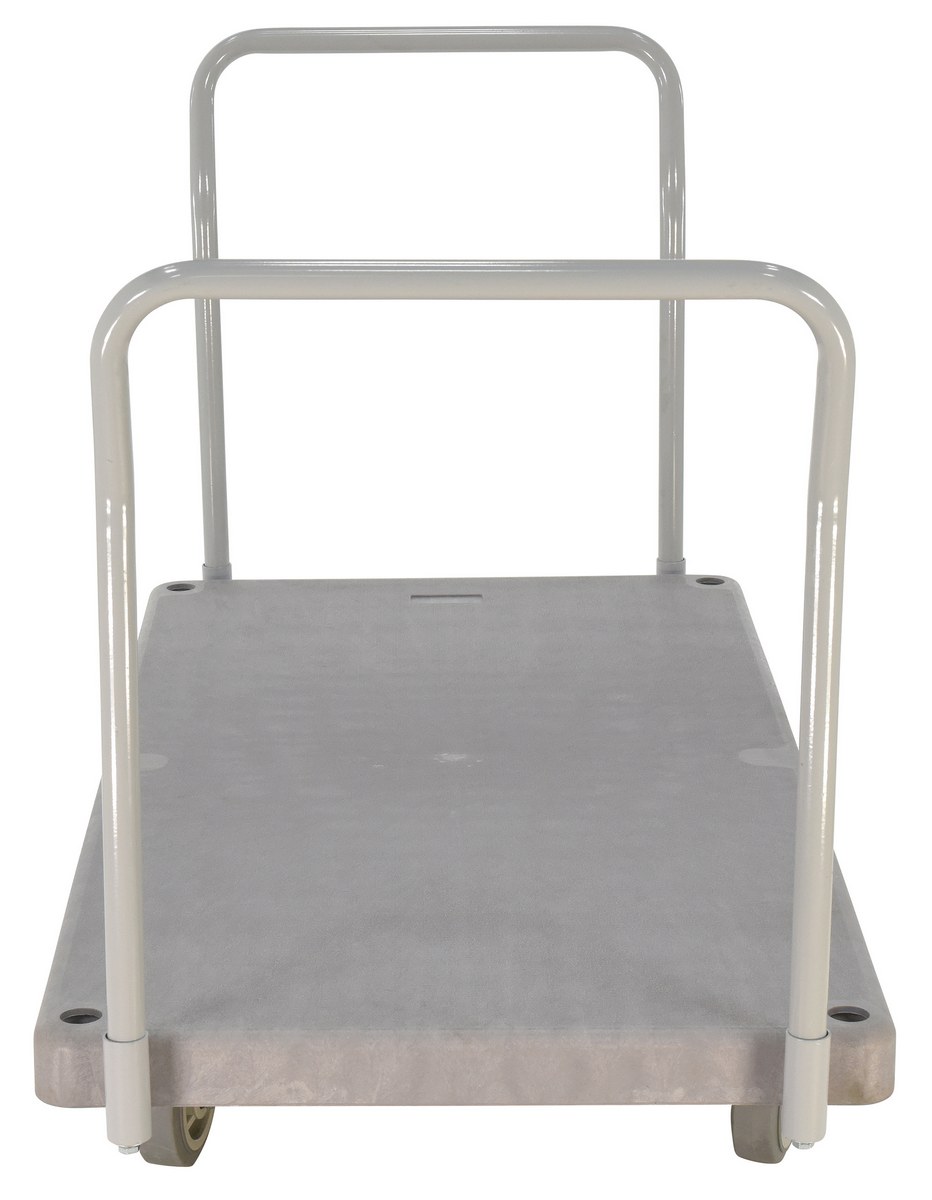 Plastic Heavy Duty Platform Truck 2 Handles 67-1/2 In. x 30 In. x 34 In. 3000 Lb. Capacity GrayThe heavy-duty plastic Platform Truck will not rust, discolor, or warp. Maintenance free and easy to clean. Honeycomb construction is reinforced for longer life. Extra square steel tube underneath platform to reinforce deck strength. This six (6) wheel unit rolls smoothly on polyurethane casters.