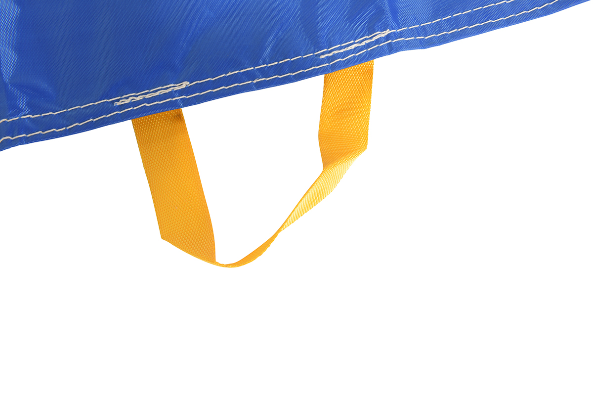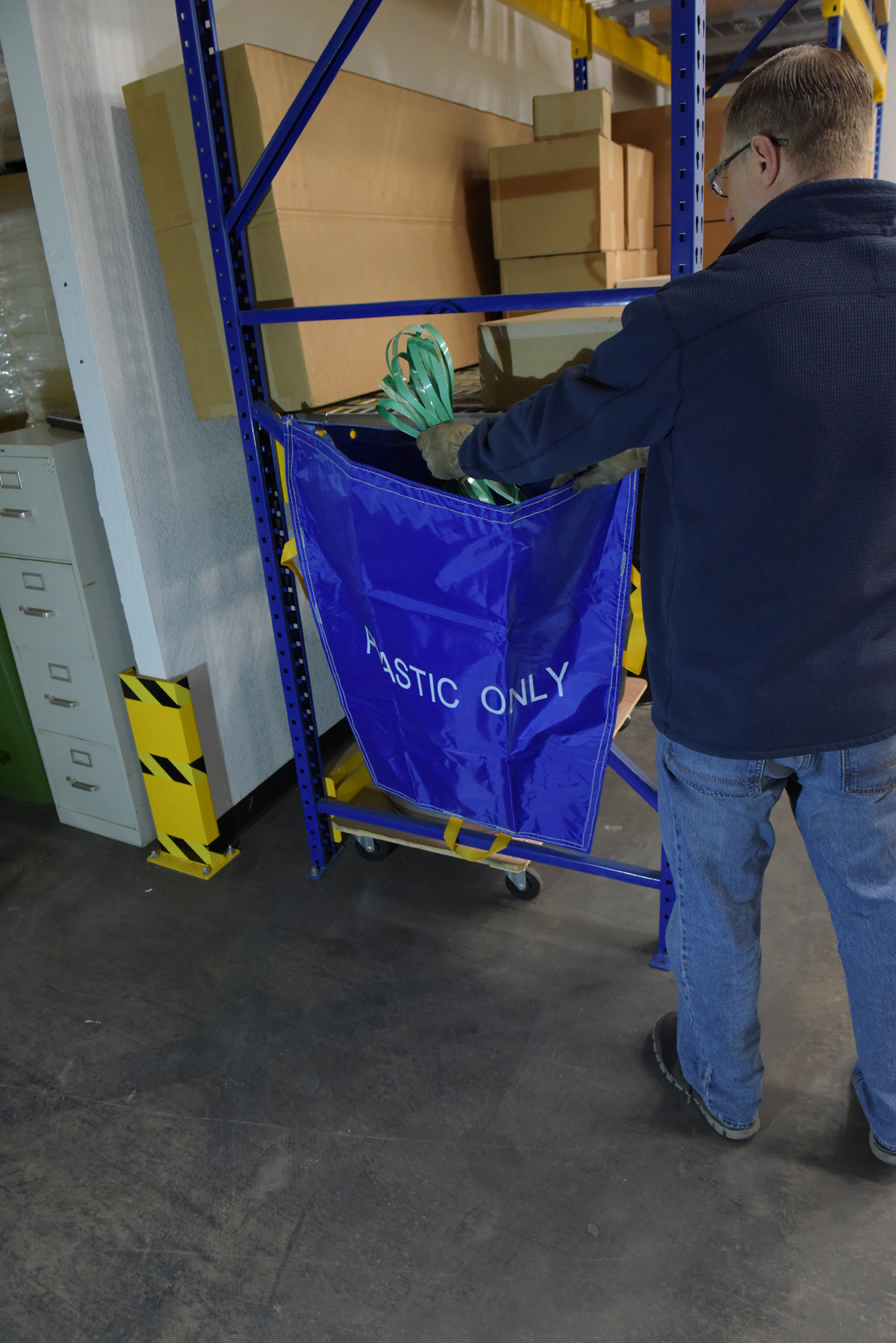 Manufactured from rugged blue waterproof polyester material the pallet rack trash bag has three (3) handles to help with emptying. "S" hooks are included for hanging on pallet rack end frames.