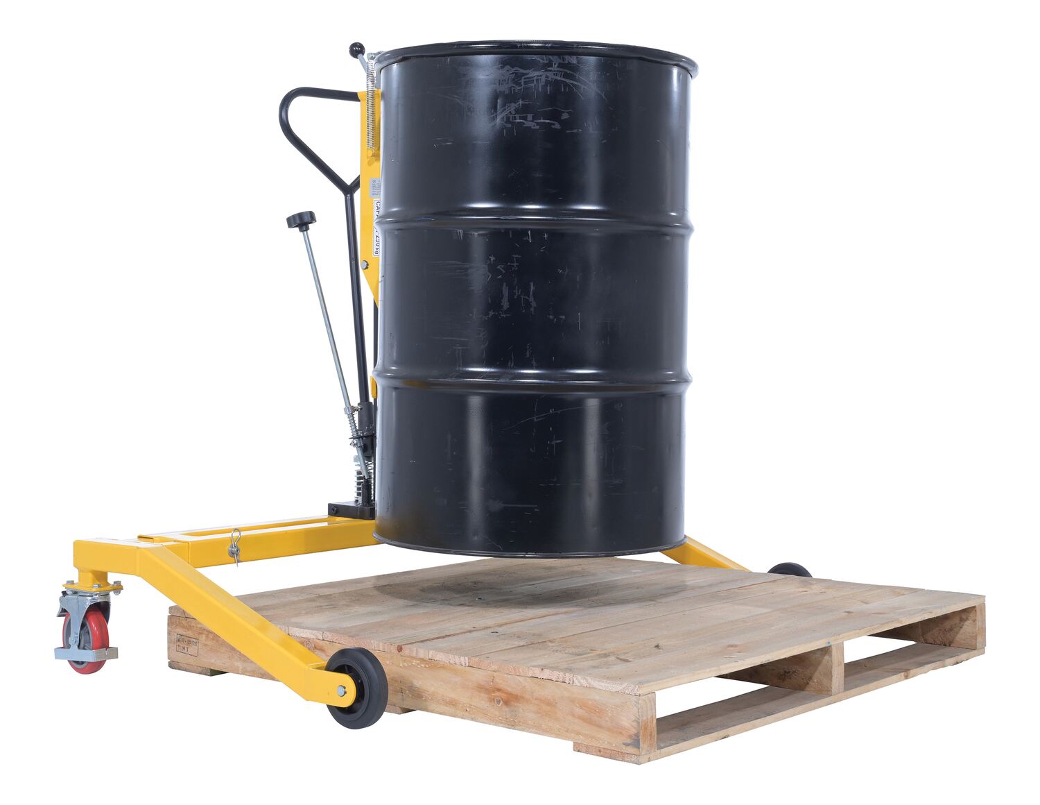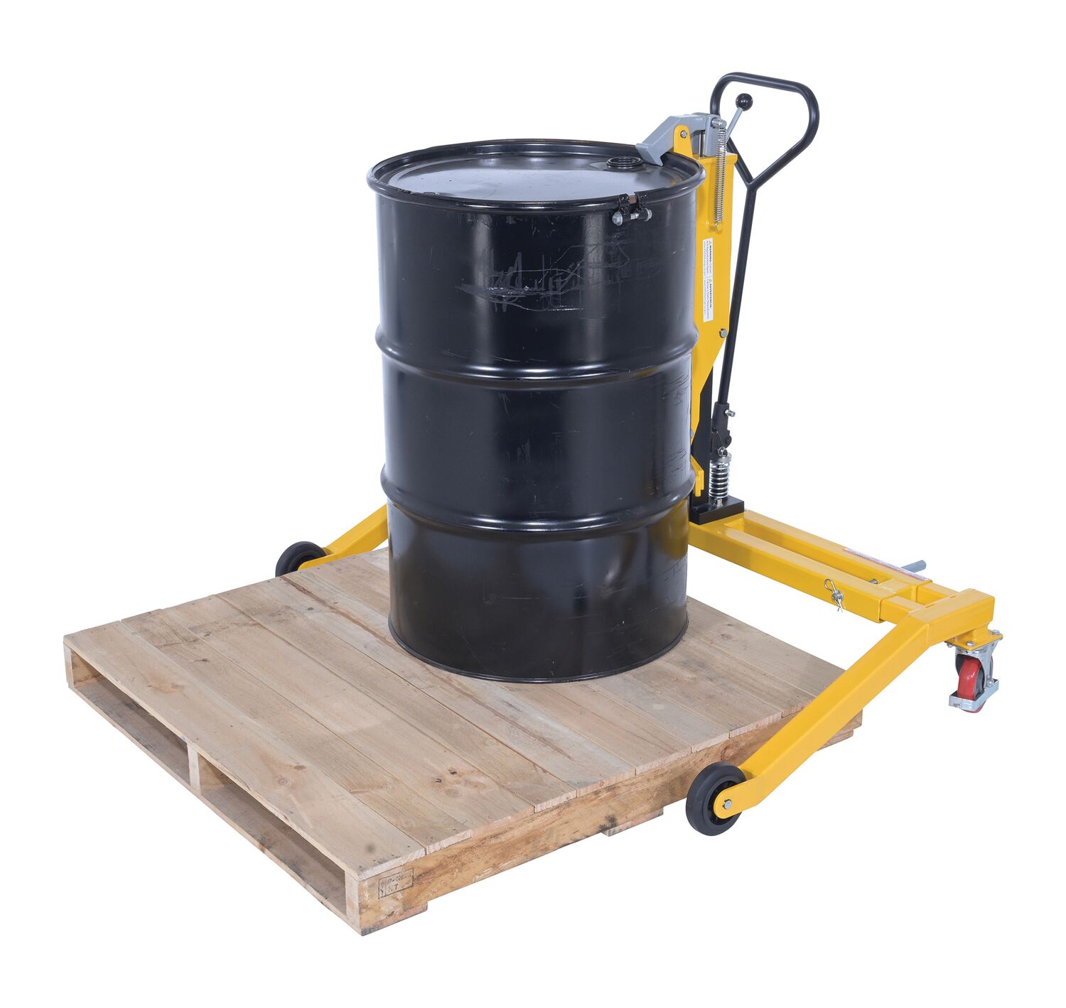 Steel Pallet Straddling Drum Truck 46 In. Long x 32 In. Wide x 47 In. Height 550 Lb. Capacity YellowA single operator can engage, lift and transport drums stored either on the center of pallets or the corner of containment skids with this pallet straddling drum truck. Works with steel drums. To engage a drum, the truck uses a rim clamp that securely grasps the top lip of the drum. Wheels provide a high degree of maneuverability; each swivel wheel is protected by guards and is equipped with brakes.