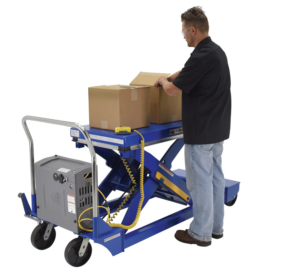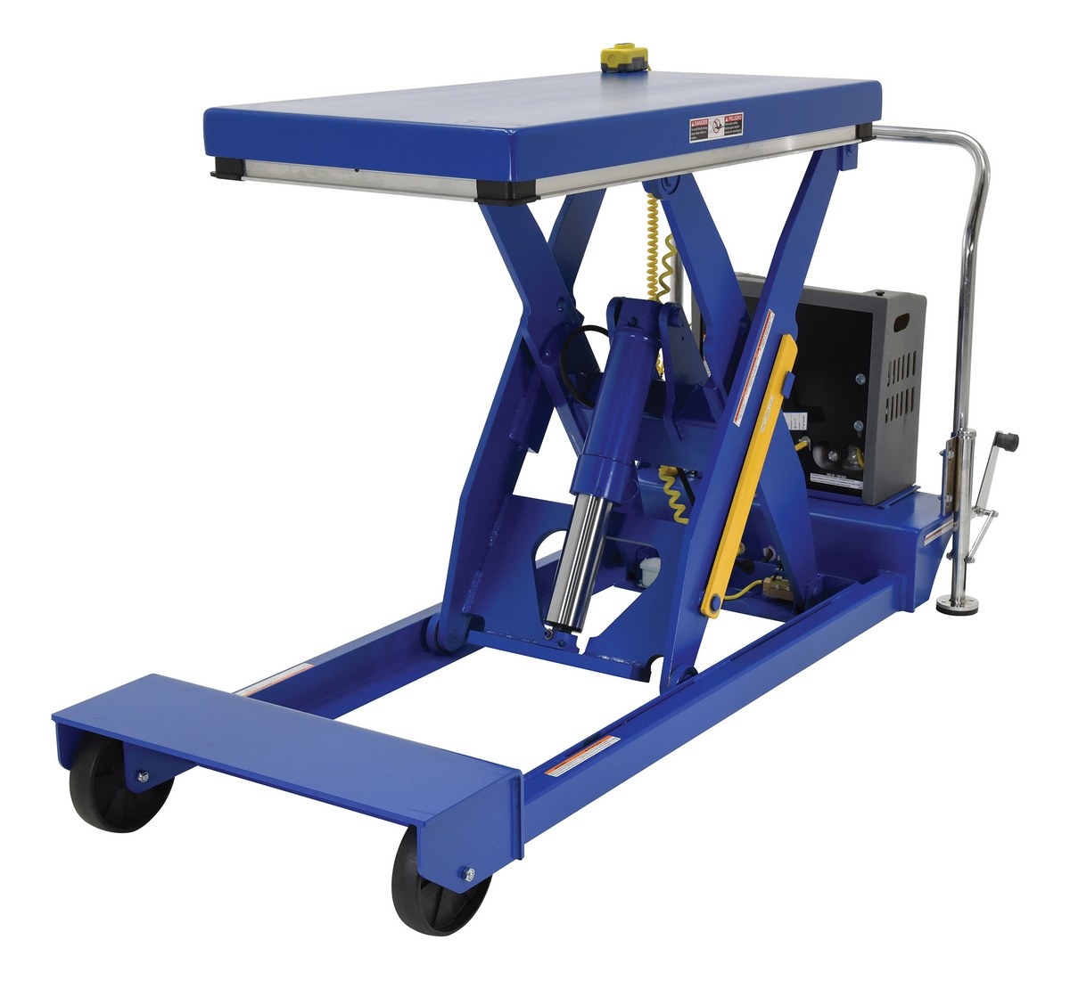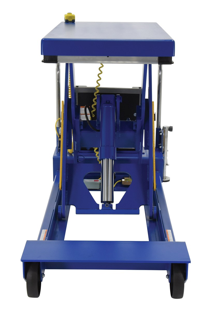 Steel Heavy Duty Portable Scissor Lift Table 24 In. x 48 In. 3000 Lb. Capacity BlueHeavy Duty portable lift scissor tables can easily transport and elevate heavy loads. Featuring glass nylon filled casters (2 swivel and 2 rigid), floor lock, patented electric pinch point guards, and magnetic hand controls. Key-operated on/off control for better security is built into the power unit. Heavy duty 12V DC powered unit with deep cycle battery, an on-board battery charger and battery charge indicator gauge comes standard.