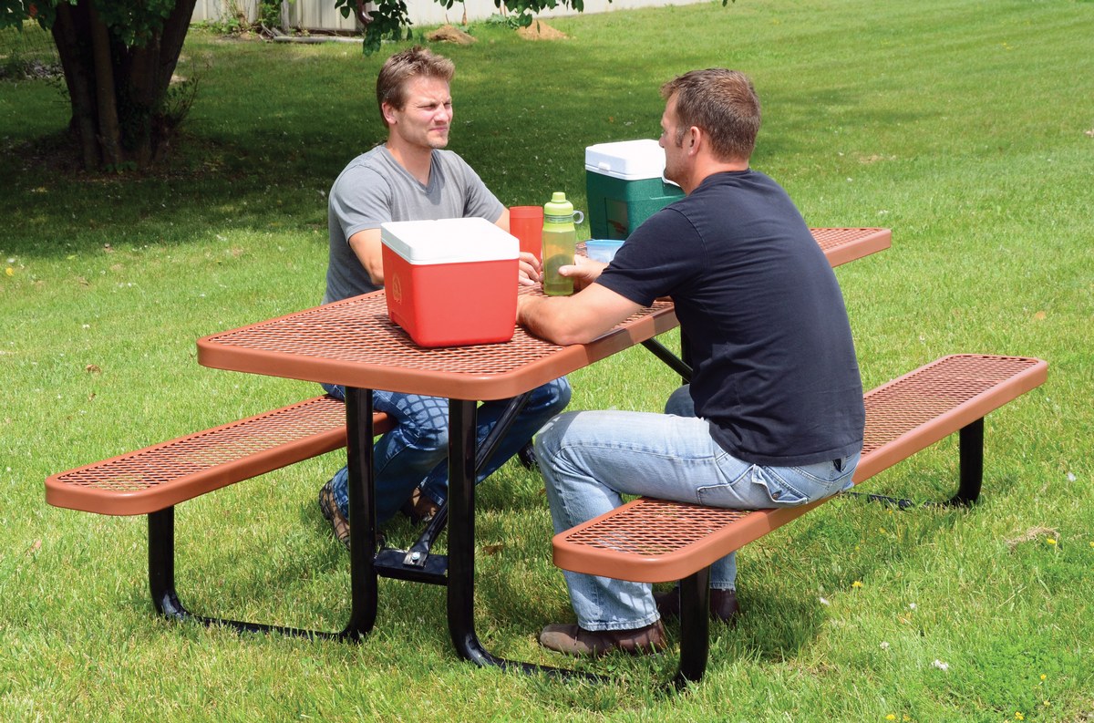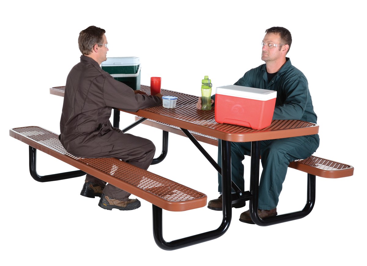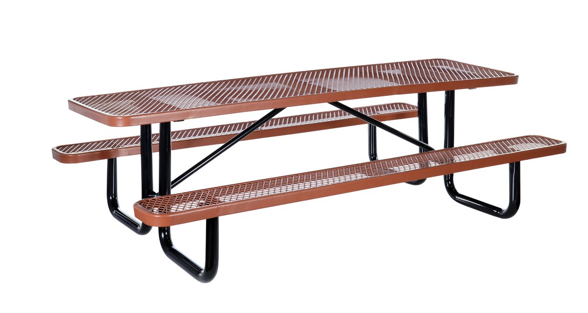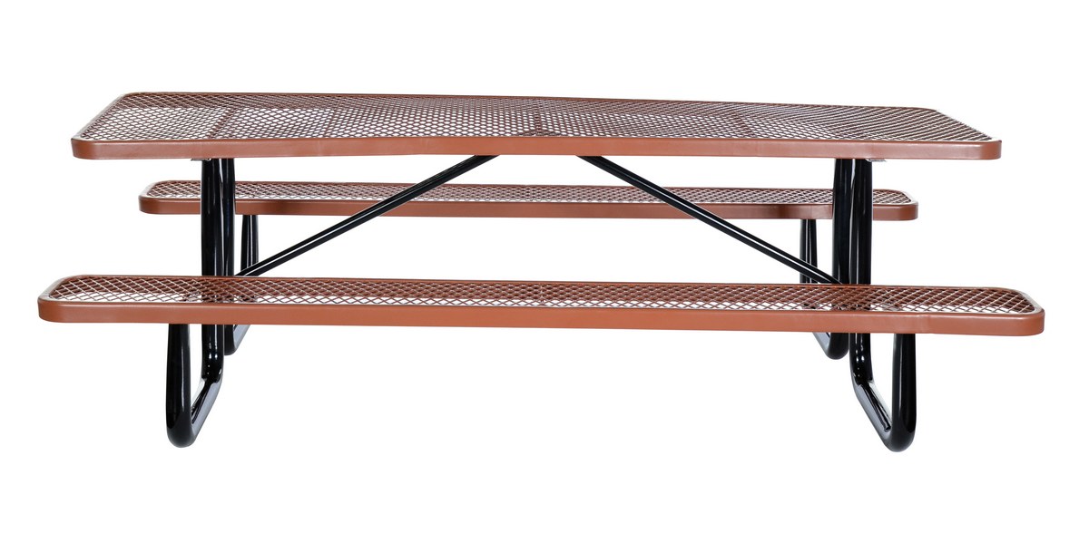Steel Picnic Table Expanded Metal Rectangle Top 30 In. x 96 In. BrownBuilt to last and highly attractive, this commercial grade metal picnic table is constructed of expanded metal that features a diamond pattern. Finished to endure the elements with virtually no maintenance. Tops and seats are coated with a rugged thermoplastic layer that's attractive and durable. Galvanized tubular steel legs and supports are protected with a black powder coat finish designed for strength and stability.