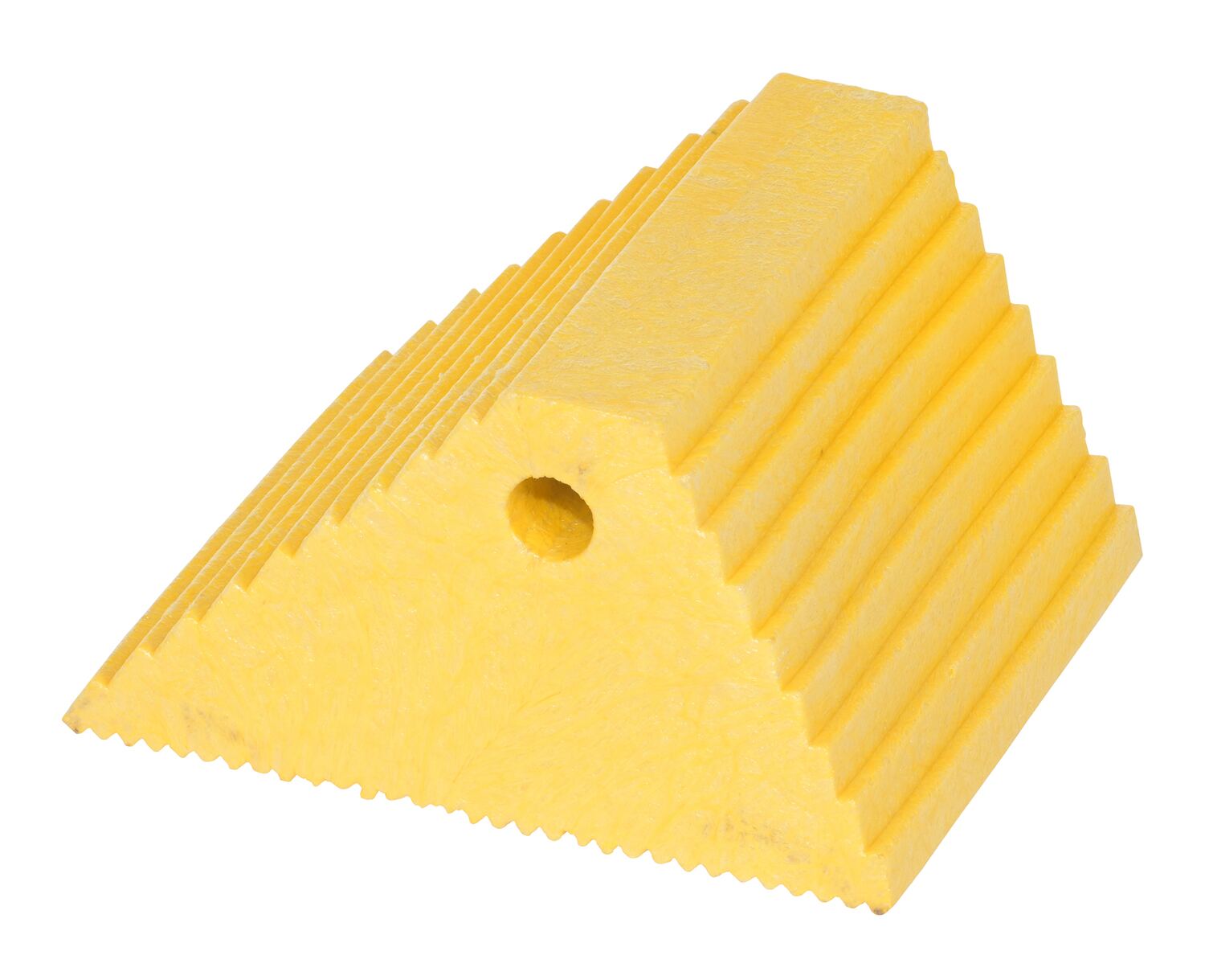 Recycled Plastic Dual Slope Wheel Chock 10-11/16 In. x 9-1/4 In. x 6 In. YellowFeatures a dual slope. One side has a 45 degrees slope while the other side has a 60 degrees slope. 100% Recycled plastic construction is chemical and sunlight resistant and delivers a strong grasp to a number of surfaces. Features a thru hole to accommodate chain attachment.