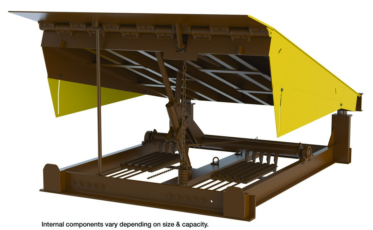 Steel Pull Chain Mechanical Dock Leveler 86"W x 110"L x 24"D Pit Dimensions 35000 Lb. Capacity Brown/YellowThe mechanical dock leveler is constructed of heavy duty checkered plate deck steel for long term support of the steel channel understructure. The dock leveler allows for easy truck loading and unloading. The leveler is engineered and designed for minimum maintenance and features a smooth pull chain operation.