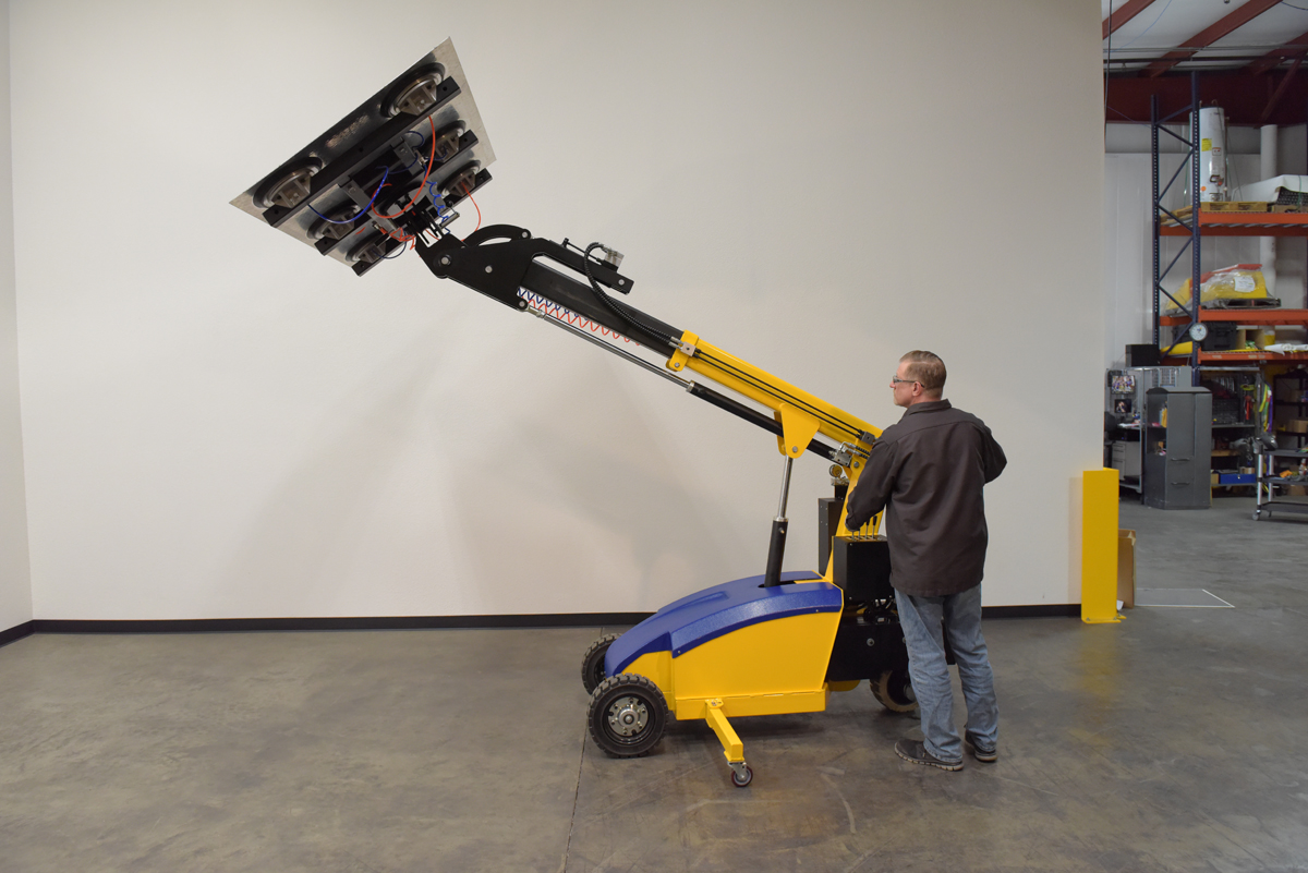 Steel Rough Terrain Vacuum Move Lifter with 6 Suction Cups 1200 Lb. Capacity Black / YellowA vacuum material lift is a great way to safely transfer large items. With the six suction cups widely spaced the lifter can be positioned in a variety of ways to best be utilized. An ergonomic walk behind steering handle allows the user to have quick maneuverability. Vacuum controls are placed at the rear of the unit to give the user complete visibility of the unit and of the item being positioned. Vacuum lifting arm is telescoping and adjustable to fit a wide range of areas. Rubber wheels are perfect for minimizing jostling while traversing a variety of surfaces. Powder coated steel construction for built in added toughness.