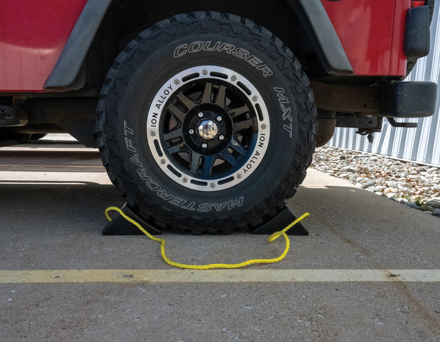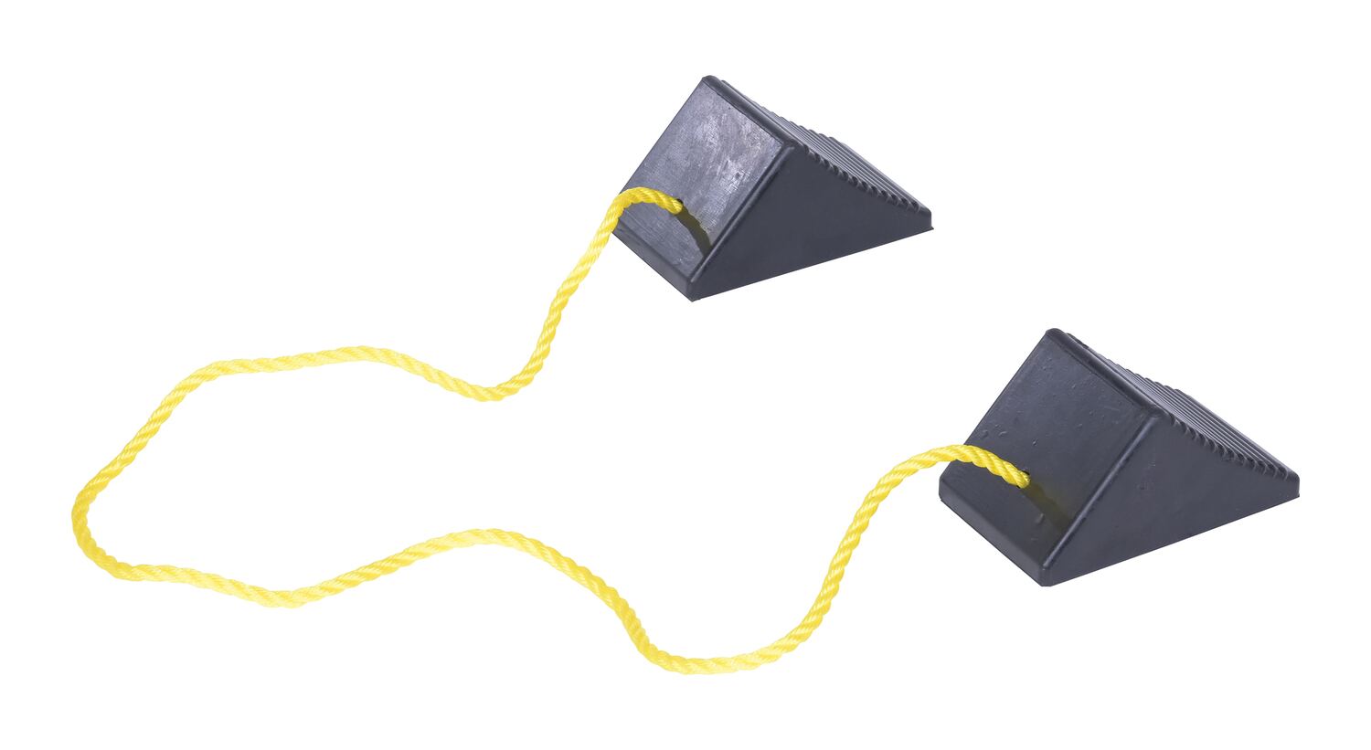 The rubber wheel chocks are constructed of reinforced rubber to provide a sure grip on virtually any surface. The curved surface contours to fit tires. Rubber resists tearing, abrasion, ozone weathering, etc. The functional design includes a rope connected to the chock and is durable in all weather conditions.