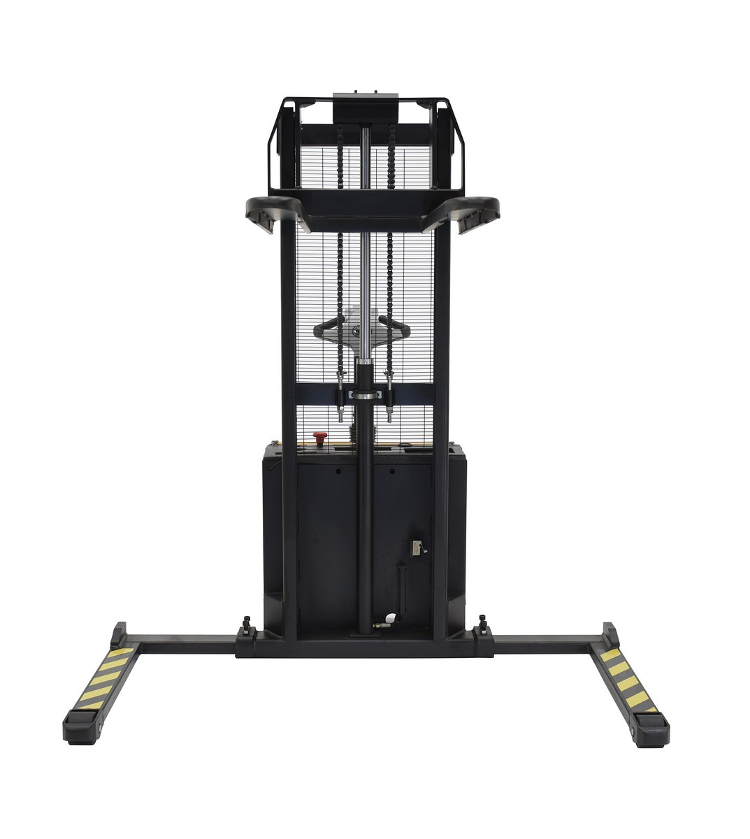 Steel Fixed Fork Lift Stacker 62 In. Raised Height 2,000 Lb. Capacity Black / YellowThe stacker with powered drive and powered lift is a fully powered electric stacker that transports loads throughout warehouse facilities quickly and with less effort. The high torque drive and lift motor handles heavy-duty jobs. The ergonomic handle features easy-to-operate throttle with infinite adjustment of forward and reverse speeds, lift/lower controls, proprietary safety-enhancing emergency reverse function, and horn. When the proprietary safety-enhancing emergency reverse function is actuated, the emergency reverse belly switch instantly reverses direction and moves the unit forward (away from the operator) until the switch is released or after five seconds have elapsed. The built-in safety circuit will automatically disable the entire unit if the emergency reverse belly switch is activated for more than five (5) seconds after which the unit must be re-set to return to normal operating conditions. This state-of-the-art safety device provides a high degree of operator protection. It includes an electromagnetic disc brake with automatic dead-man feature that activates when user releases the handle. The power lifter features a lead acid deep cycle battery, integral battery charger, and a battery level gauge. The stacker rolls smoothly on poly-on-steel steer and load wheels.