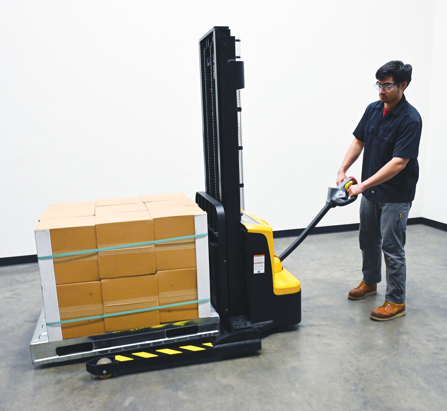 Steel Adjustable Double Mast Stacker 118 In. Raised Height Variable Speed 2200 Lb. Capacity BlackThe double mast fully powered electric stacker transports loads throughout warehouse facilities quickly and with less effort. High torque drive and lift motor handles heavy duty jobs. Ergonomic handle features lift/lower controls, proprietary safety enhancing emergency reverse function, and horn. The unit includes an electromagnetic disc brake with automatic dead-man feature. Powered lifter has two 12V lead acid deep cycle batteries, integral battery charger, and a battery level gauge.