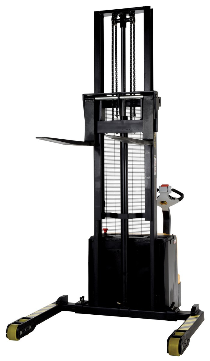 The double mast fully powered electric stacker transports loads throughout warehouse facilities quickly and with less effort. High torque drive and lift motor handles heavy duty jobs. Ergonomic handle features lift/lower controls, proprietary safety enhancing emergency reverse function, and horn. The unit includes an electromagnetic disc brake with automatic dead-man feature that activates when user releases the handle. Powered lifter has two batteries, integral battery charger, and a battery level gauge. Horn included.