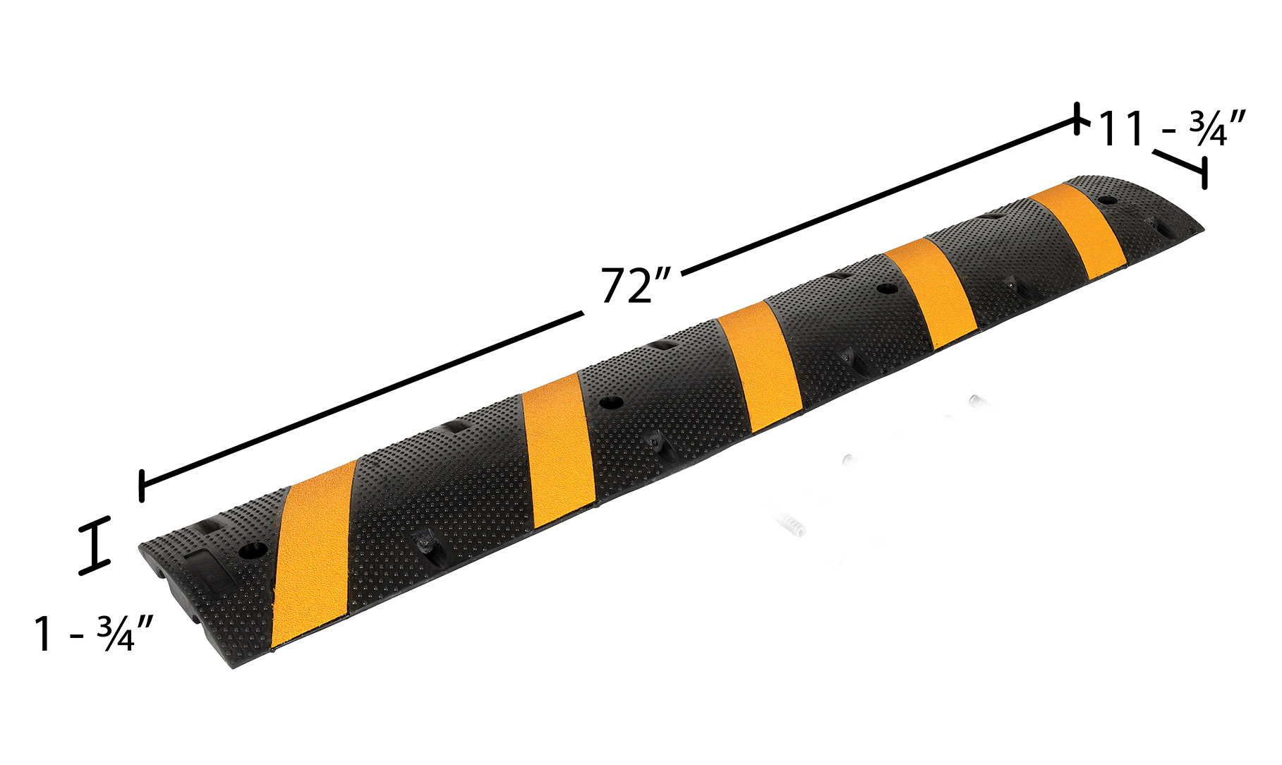 The molded rubber speed bump is ideal for warning drivers in parking areas and warehouses. Featuring reflective diagonal stripes and "cats eyes" for visibility, a heavy-duty molded rubber construction for durability, and pre drilled installation holes. Mounting hardware included. Optional end caps available upon request.
