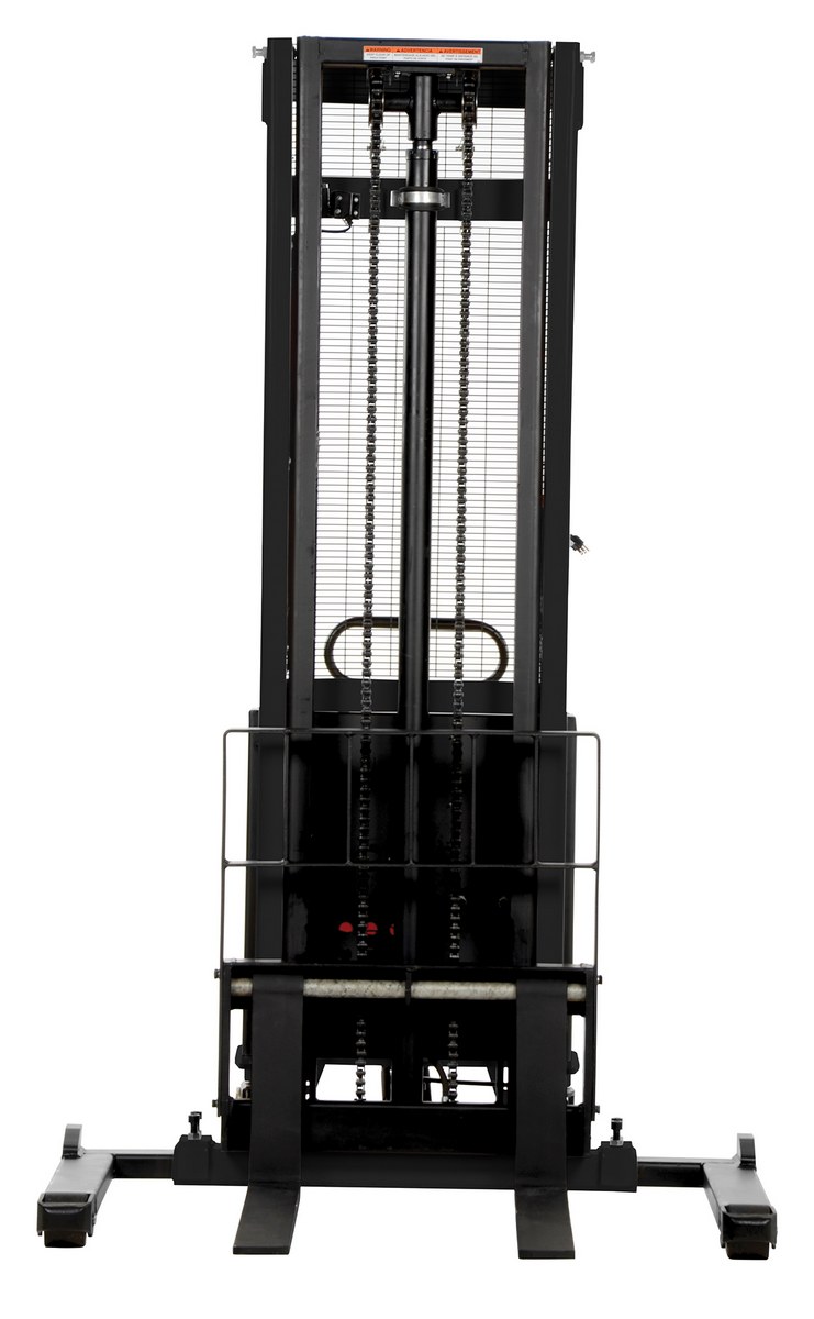 Steel Adjustable Stacker with Powered Lift 137 In. Raised Height 2,000 Lb. Capacity Black / YellowThe stacker powered lift is a semi-electric stacker with a powered lift that will raise and lower loads quickly and easily. The manual push operation stacker is made using high quality material and parts. The stacker is easily maneuvered using the standard pulling handle with adjustable forks and adjustable support legs. The stacker is highly efficient and durable while working with pallets or skids. It features an integral battery charger and battery level gauge.