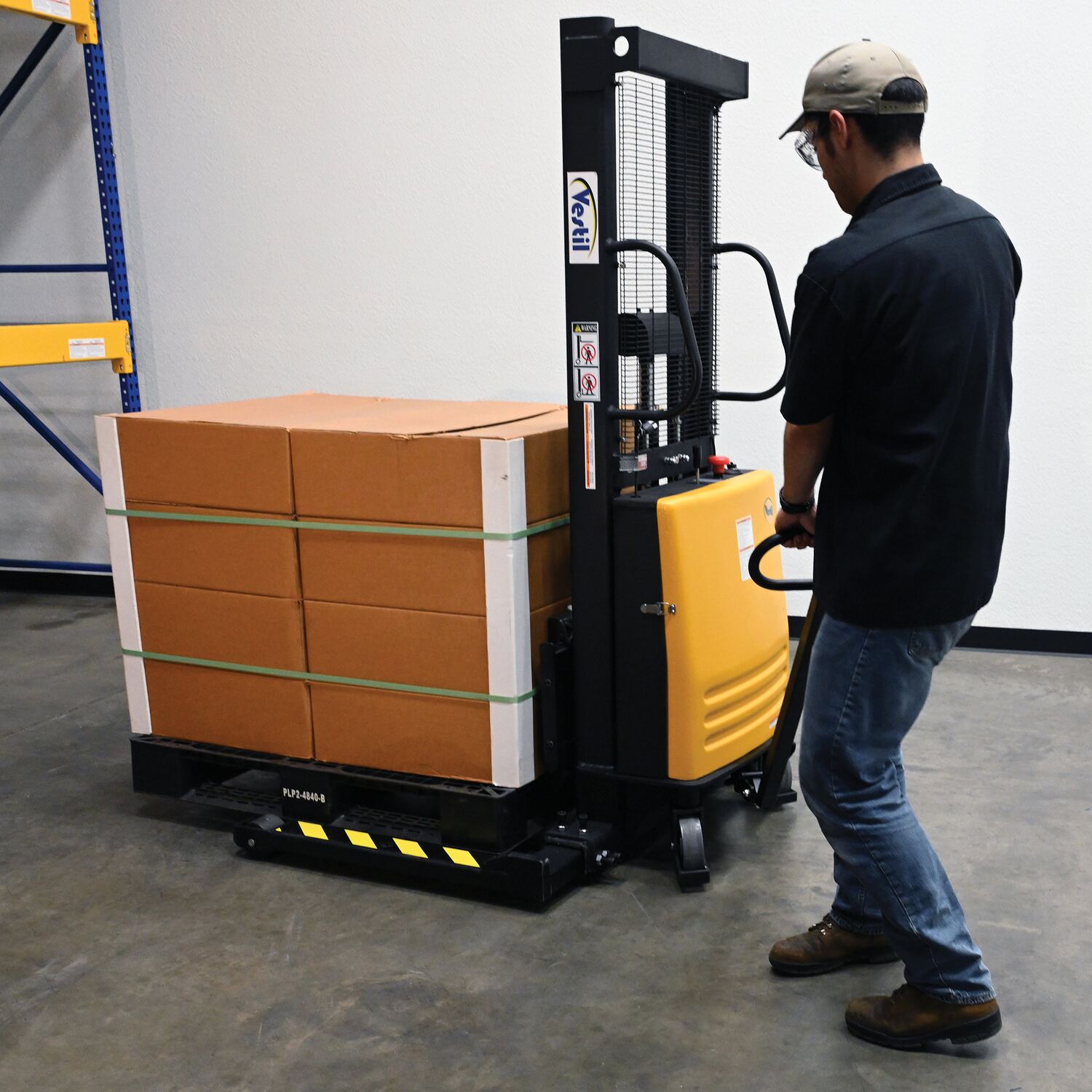 Steel Adjustable Stacker with Powered Lift 63 In. Raised Height 2,000 Lb. Capacity Black/YellowThe stacker powered lift is a semi-electric stacker with a powered lift that will raise and lower loads quickly and easily. The manual push operation stacker is made using high quality material and parts. The stacker is easily maneuvered using the standard pulling handle with adjustable forks and adjustable support legs. The stacker is highly efficient and durable while working with pallets or skids. It features an integral battery charger and battery level gauge.