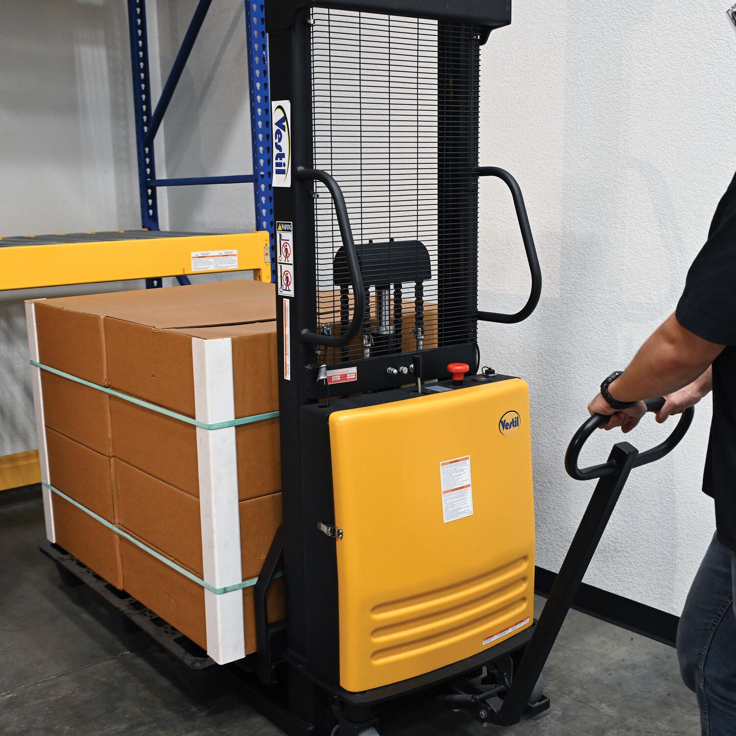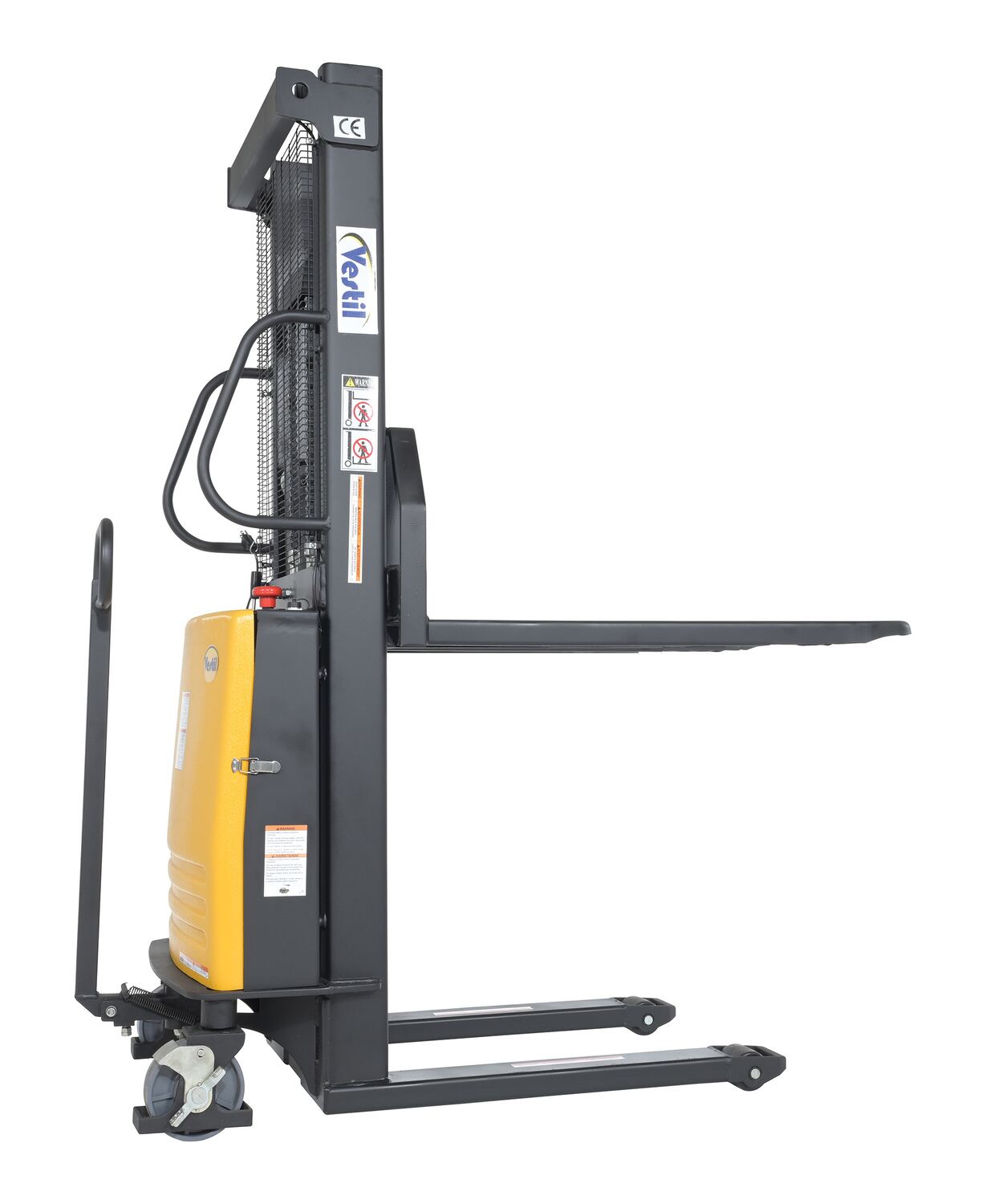 Steel Fixed Stacker with Powered Lift 63 In. Raised Height 2,000 Lb. Capacity YellowThe stacker powered lift is a semi-electric stacker with a powered lift that will raise and lower loads quickly and easily. The manual push operation stacker is made using high quality material and parts. The stacker is easily maneuvered using the standard pulling handle. The stacker is highly efficient and durable. It features an integral battery charger and battery level gauge. The unit works with skids only and features fixed forks along with fixed support legs.