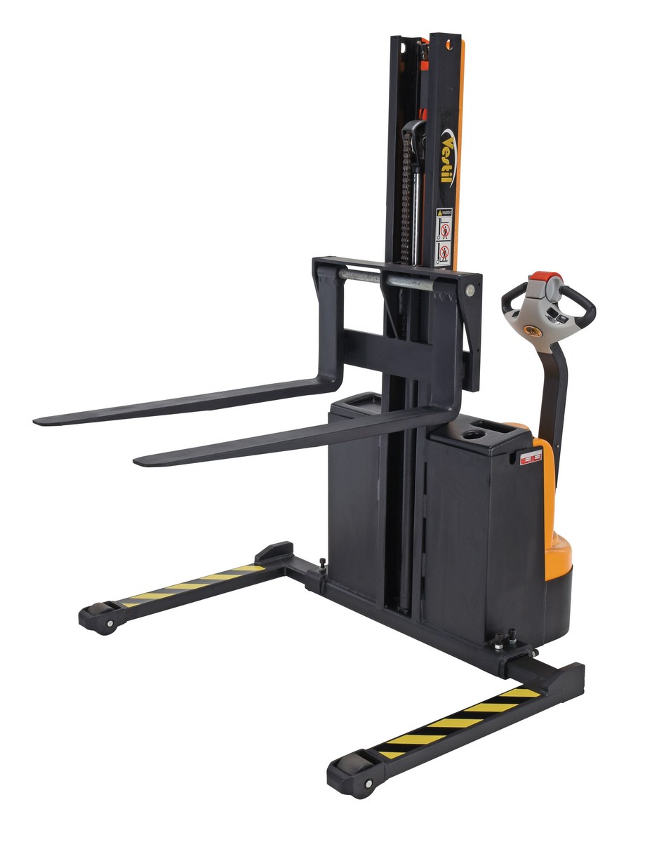Steel Narrow Mast Stacker DC Powered 62 In. Raised Height Adjustable Forks and Support Legs 2,200 Lb. Capacity Black / YellowThe narrow mast stacker is great for the shipping and manufacturing facilities. The stacker provides a fast efficient solution to loading and unloading products in closely confined areas. The stacker features a simple throttle design for lifting control, as well as, infinite forward and reverse speed adjustments. The unit drives on poly on steel steering and load wheels, which provide excellent maneuverability. A battery charger, gauge and horn are included. Models are available with fixed or adjustable forks as well as fixed or adjustable leg supports.