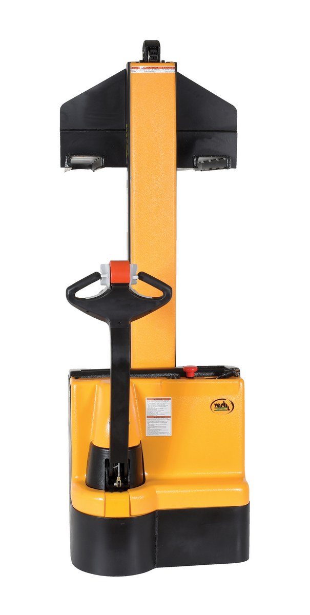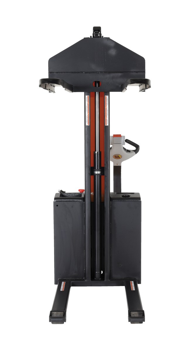Steel Narrow Mast Stacker DC Powered 62 In. Raised Height Fixed Fork 27 In. Fork Width 1,500 Lb. Capacity Black / Yellow