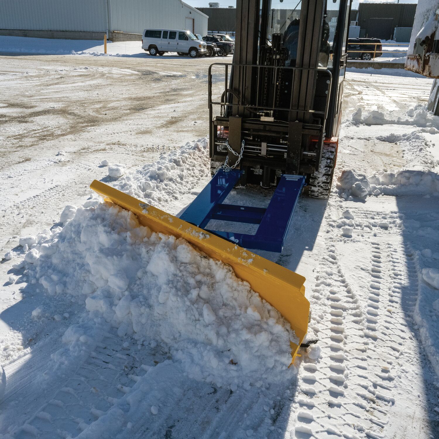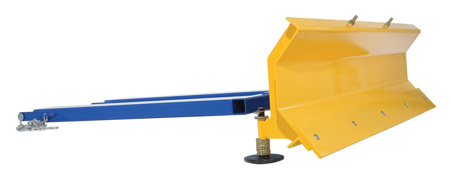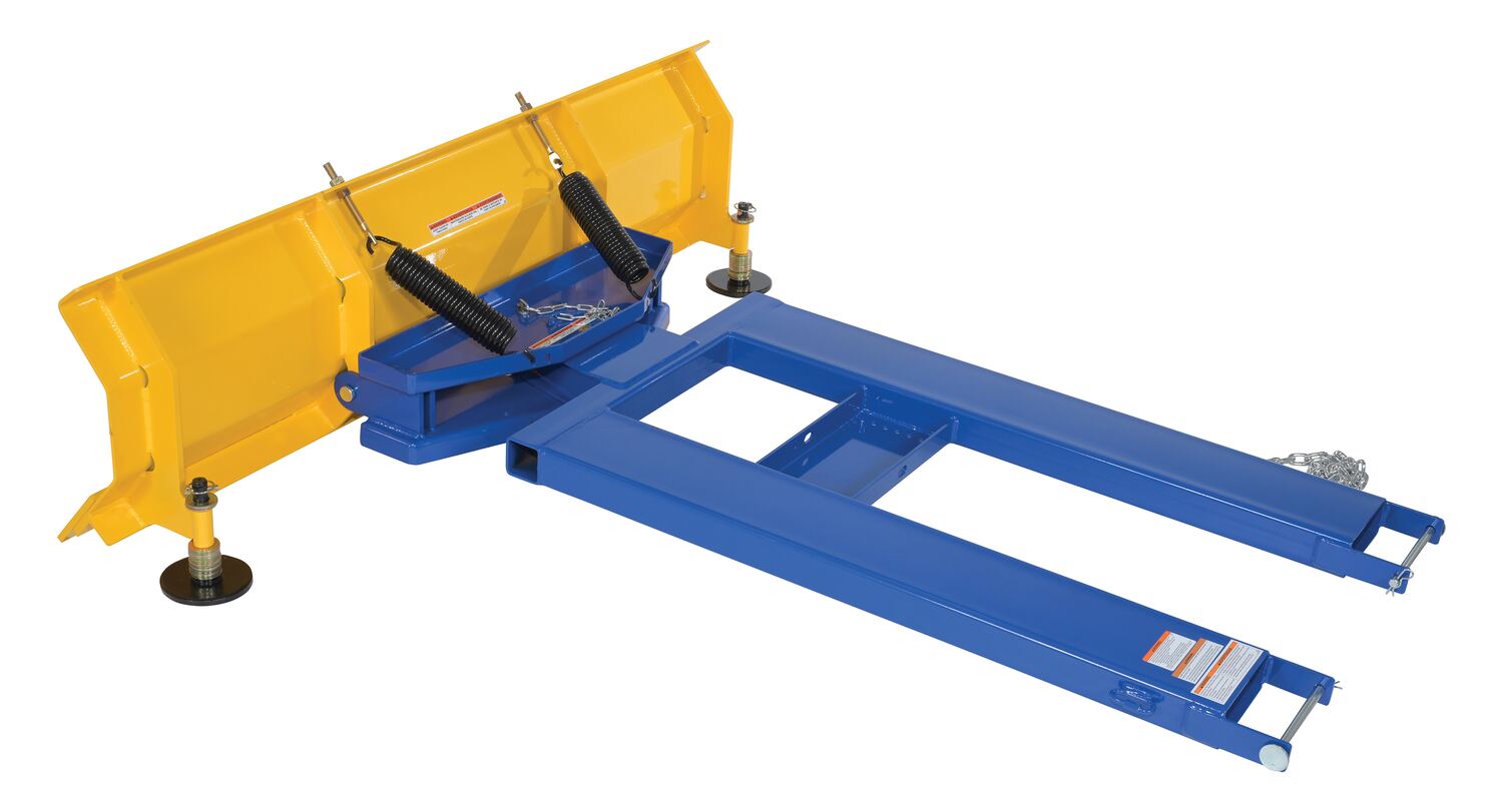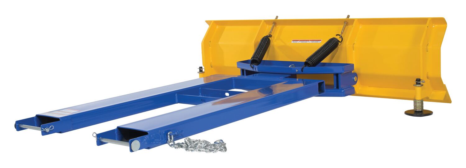 Steel Fork Mount Snow Plow 72" Blade Blue/YellowWhen snow needs moved and removed, look no further than the fork truck snow plow. The unique design attaches to fork truck forks, so no power supply is needed! The design of the plow keeps the weight to the back of the unit, towards fork truck mast. Manual pivot mechanism for angled plowing on both sides. Steel construction with baked in powder coat finish for added toughness.