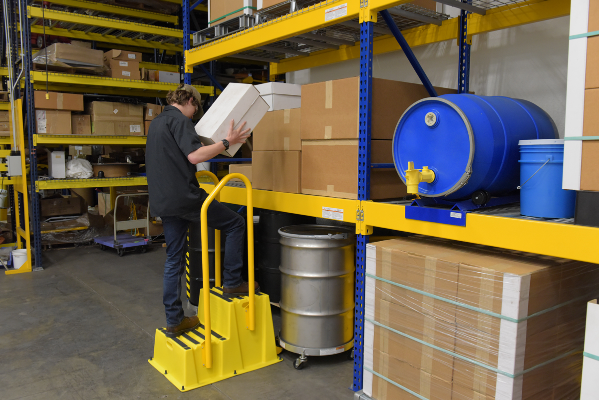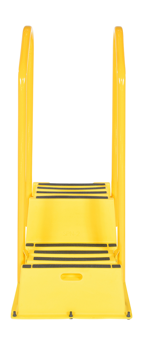 Polyethylene Nestable with Handrails Casters 2 Step 500 Lb. Capacity YellowA poly step stool is a great asset for on the go or in a permanent setting. A lightweight design with front and side cutout handles, allow the user to easily transfer the stool to a preferred spot. The taped step surfaces ensure safe footing while traversing up and down the steps. Includes bolt on handrail and casters. The hand rails height allows the unit to be pushed or pulled into the desired position, minimizing bending and twisting by the user. Steps can be nested to minimize footprint when not in use.