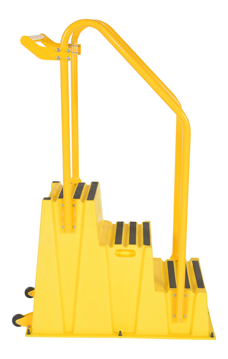 Polyethylene Nestable with Hand and Back Rails Casters 3 Step 500 Lb. Capacity YellowA poly step stool is a great asset for on the go or in a permanent setting. A lightweight design with front and side cutout handles, allow the user to easily transfer the stool to a preferred spot. The taped step surfaces ensure safe footing while traversing up and down the steps. Includes bolt on back rail, handrail, and casters. The hand rails height allows the unit to be pushed or pulled into the desired position, minimizing bending and twisting by the user. Steps can be nested to minimize footprint when not in use.