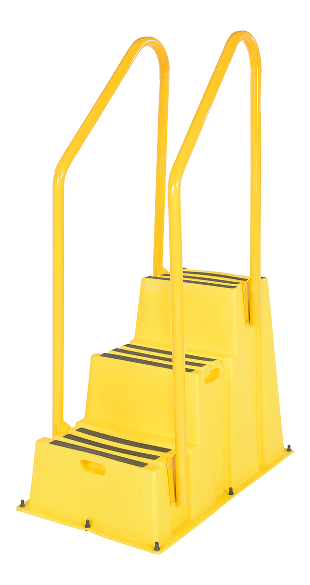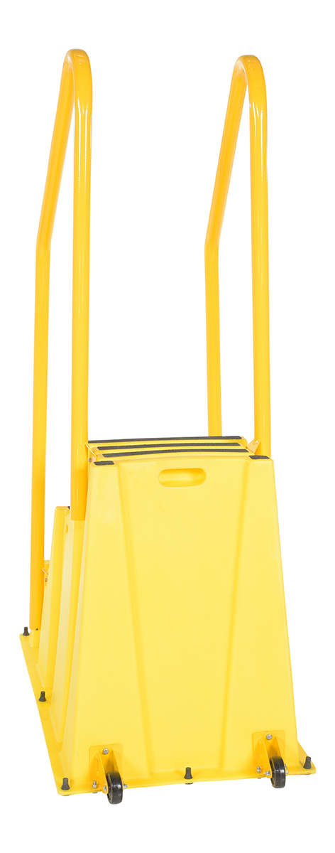 Polyethylene Nestable with Handrails Casters 3 Step 500 Lb. Capacity YellowA poly step stool is a great asset for on the go or in a permanent setting. A lightweight design with front and side cutout handles, allow the user to easily transfer the stool to a preferred spot. The taped step surfaces ensure safe footing while traversing up and down the steps. Includes bolt on handrail and casters. The hand rails height allows the unit to be pushed or pulled into the desired position, minimizing bending and twisting by the user. Steps can be nested to minimize footprint when not in use.