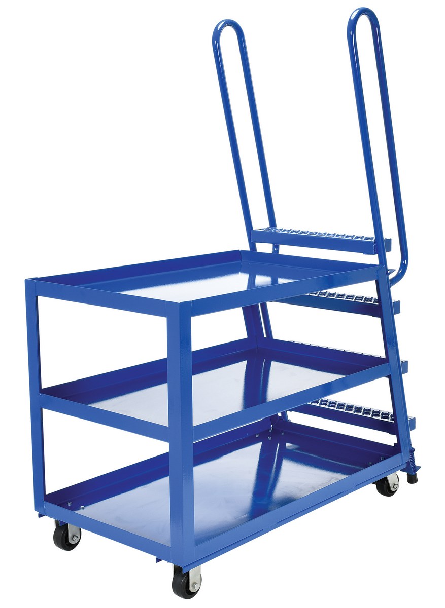 This oversized hi-duty stock picker truck is perfect for large jobs. Ideal for oversized cartons, boxes, parts, and supplies. A spring loaded steel ladder for sure, safe climbing, and loading. Steps have non-skid footing with self-cleaning surface. This stock picker truck has three (3) shelves. Built of durable steel construction. Unit is powder coated a blue finish.