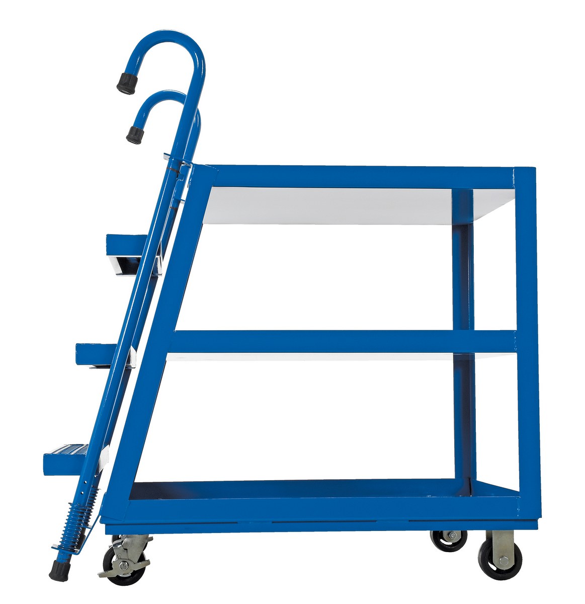 Steel Stock Picker 3 Shelf with Mold On Rubber Casters 43-3/4 In. x 27-7/8 In. x 50-1/8 In. 1,000 Lb. Capacity BlueCombine the mobility of a cart with the versatility of a step ladder with this stock picker truck. Convenient spring loaded steel step ladder holds the cart securely in place while a person is standing on the ladder. Crutch tip ladder prevents the cart from moving while stocking. Springs then return the ladder to the raised position once personnel exit the step. All shelves have the lip turned up to prevent items from falling off.