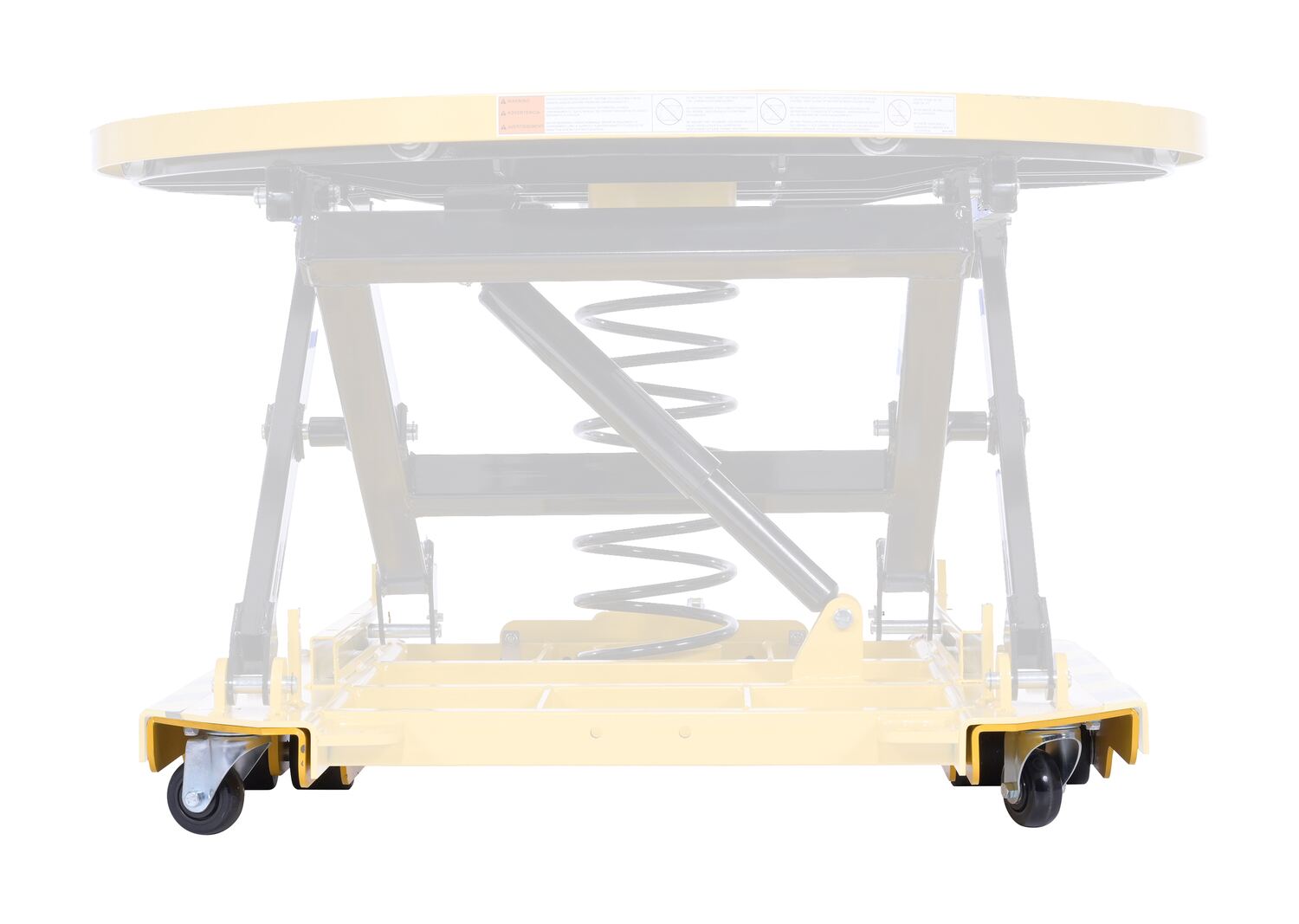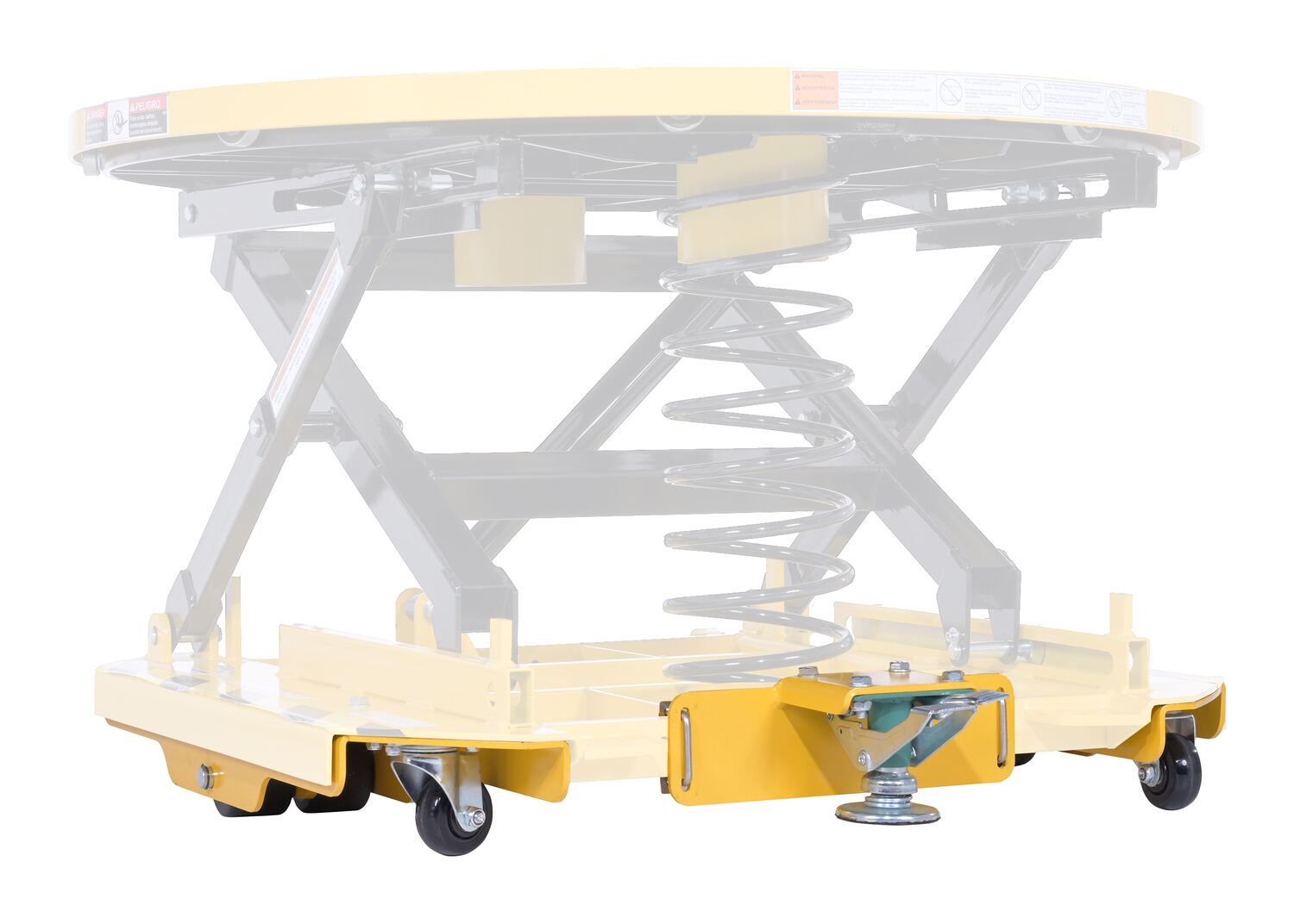Spring Scissor Table Glass Filled Nylon Caster Kit Option 4,500 Lb. Capacity YellowTurning a stationary spring loaded table into a portable one has never been easier. With the caster kit option, the table can now be wheeled around the workplace without the needed of additional lifting equipment. The casters are attached to individual steel pieces which are then secured to the fork pockets of the existing spring loaded table. A floor brake is also included to maintain stability during loading and unloading.