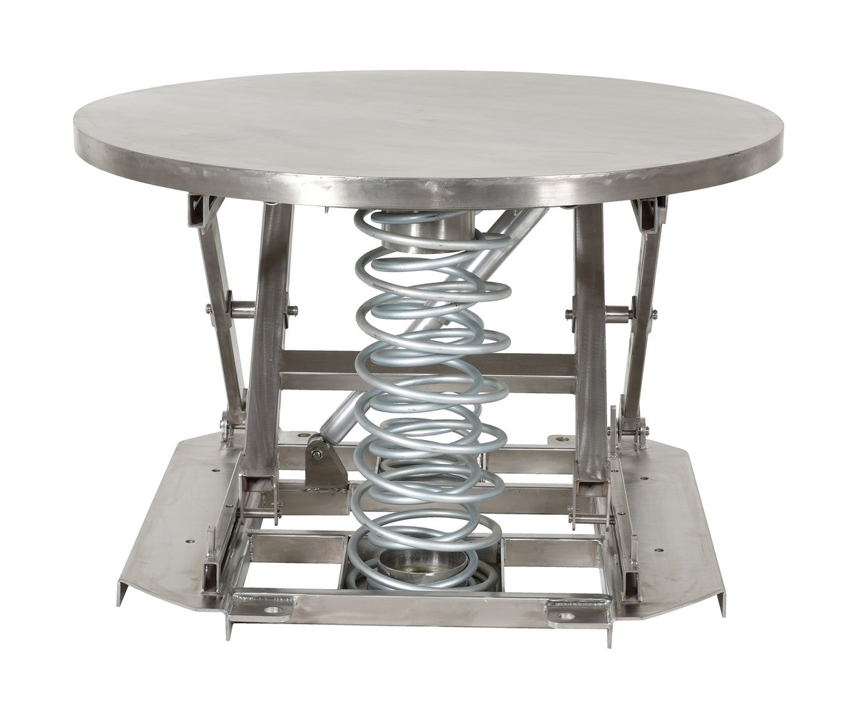 Partially Stainless Steel Solid Manual Carousel Top Spring Scissor Table 4,500 Lb. Capacity SilverThe spring scissor table is ideal for distributing and shipping facilities. The unit allows the user to transfer products from work space to work space, while holding an ergonomically friendly position. The frame is designed of a stainless steel construction, which allows for strength, durability, and a long lifespan. The scissor mechanism raises the unit to the desired height, while the internal spring provides support when unit is being loaded and unloaded. The round top can be manually rotated 360 degrees for improved packaging and handling capabilities.