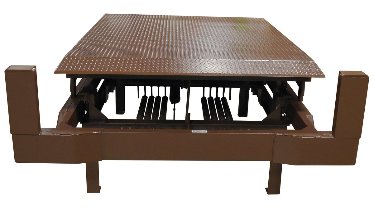 This is a fully automatic loading ramp where there is no dock attendant needed. It is a recessed unit with legs needing a full 48 (in.) deep pit. It consists of a lift by-pass for safety and toe guards on each side. As the truck backs against the twin actuating arms (bumpers) it pushes the carriage back. The dock and trailer must be raised for this process to work. As the carriage goes back the deck goes up. When the carriage bumpers contact the dock, the deck floats down to rest on the trailer. When the truck pulls out, the deck returns to level supported position automatically.