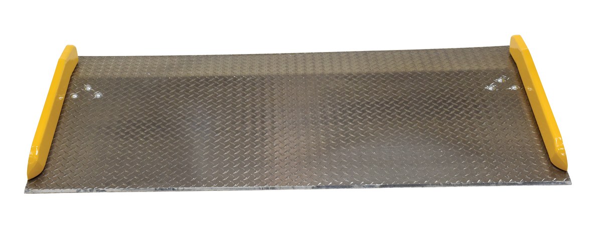 Aluminum Dock Board Steel Curb 72 In. x 36 In. 10,000 Lb. Capacity SilverThe Aluminum truck dock board with steel safety curbs is designed for portability and safety. The deck is made of tough high strength aluminum tread plate. The edges are beveled for smooth entry and exit. Safety curbs are coated yellow and are constructed of steel with cast tapered ends. Steel legs are bolted on for increased durability. Canted locking legs for easier truck portability. Manufactured in compliance with OSHA. The capacity is based upon the heaviest type of equipment used plus the maximum load carried times the single axle rating of total load. Dynamic loading, driver tendencies, speed and frequency of use must be considered. When using three-wheeled fork trucks order dock board with capacity at least four-times the lifting capacity of fork truck. The width of the dock board should be at least fifteen (15) inches wider than the load or equipment passing between the curbs. If the load does not pass between curbs, but is elevated above, add fifteen (15) inches to overall width of equipment.