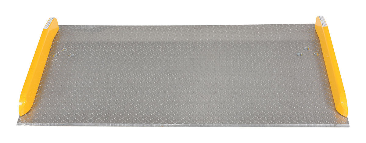 Aluminum Dock Board Steel Curb 60 In. x 36 In. 15,000 Lb. Capacity SilverThe Aluminum truck dock board with steel safety curbs is designed for portability and safety. The deck is made of tough high strength aluminum tread plate. The edges are beveled for smooth entry and exit. Safety curbs are coated yellow and are constructed of steel with cast tapered ends. Steel legs are bolted on for increased durability. Canted locking legs for easier truck portability. Manufactured in compliance with OSHA. The capacity is based upon the heaviest type of equipment used plus the maximum load carried times the single axle rating of total load. Dynamic loading, driver tendencies, speed and frequency of use must be considered. When using three-wheeled fork trucks order dock board with capacity at least four-times the lifting capacity of fork truck. The width of the dock board should be at least fifteen (15) inches wider than the load or equipment passing between the curbs. If the load does not pass between curbs, but is elevated above, add fifteen (15) inches to overall width of equipment.