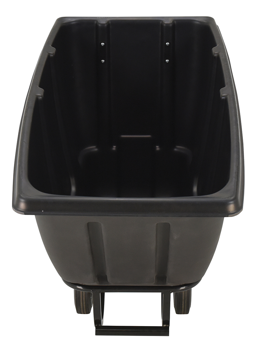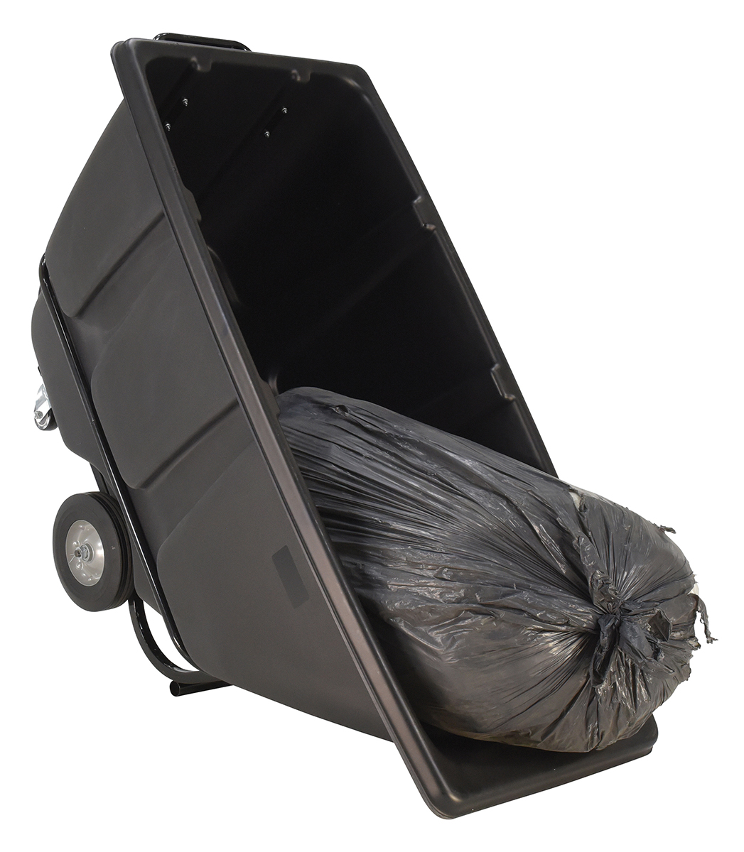 Durable plastic construction allows for collecting waste from multiple bins at a collective time. Great for warehouses, fairs, ball parks, schools, etc. Strong, one-piece molded polyethylene body with steel base tip support and a balanced design to allow for simple dumping by one person. Easily portable on 2 large rubber wheels and two swivel wheels. Not for use with fork trucks. Black color design.