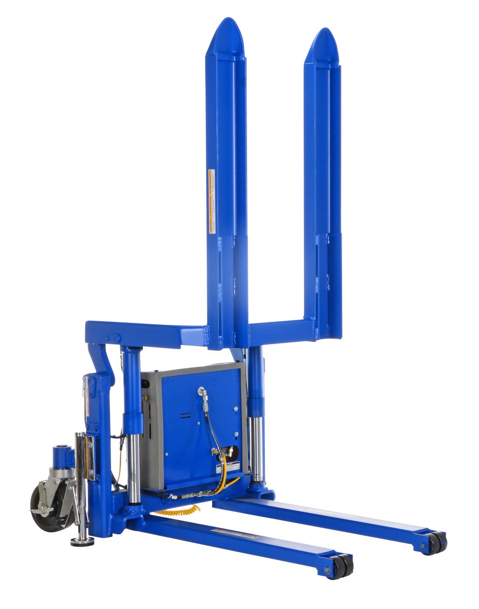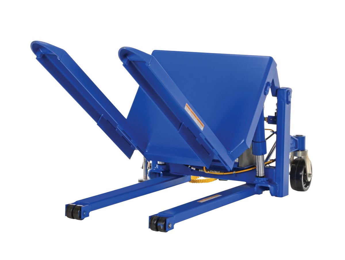 Steel Tilt Master AC Powered 2,000 Lb. Capacity BlueThe tilt master lifts and positions filled tote boxes or baskets without the need of a fork truck or lift table using the newly designed heavy-duty tilt master. The tilter will function as transporters by moving completed products from work station to work station without waiting for a fork truck. The lift has a thin profile to allow the user to get as close to the load as possible, a standard floor lock and rolls easily on the phenolic steering wheels. It is designed to be used with open bottom pallets or skids. This unit is powered by an electric AC motor.