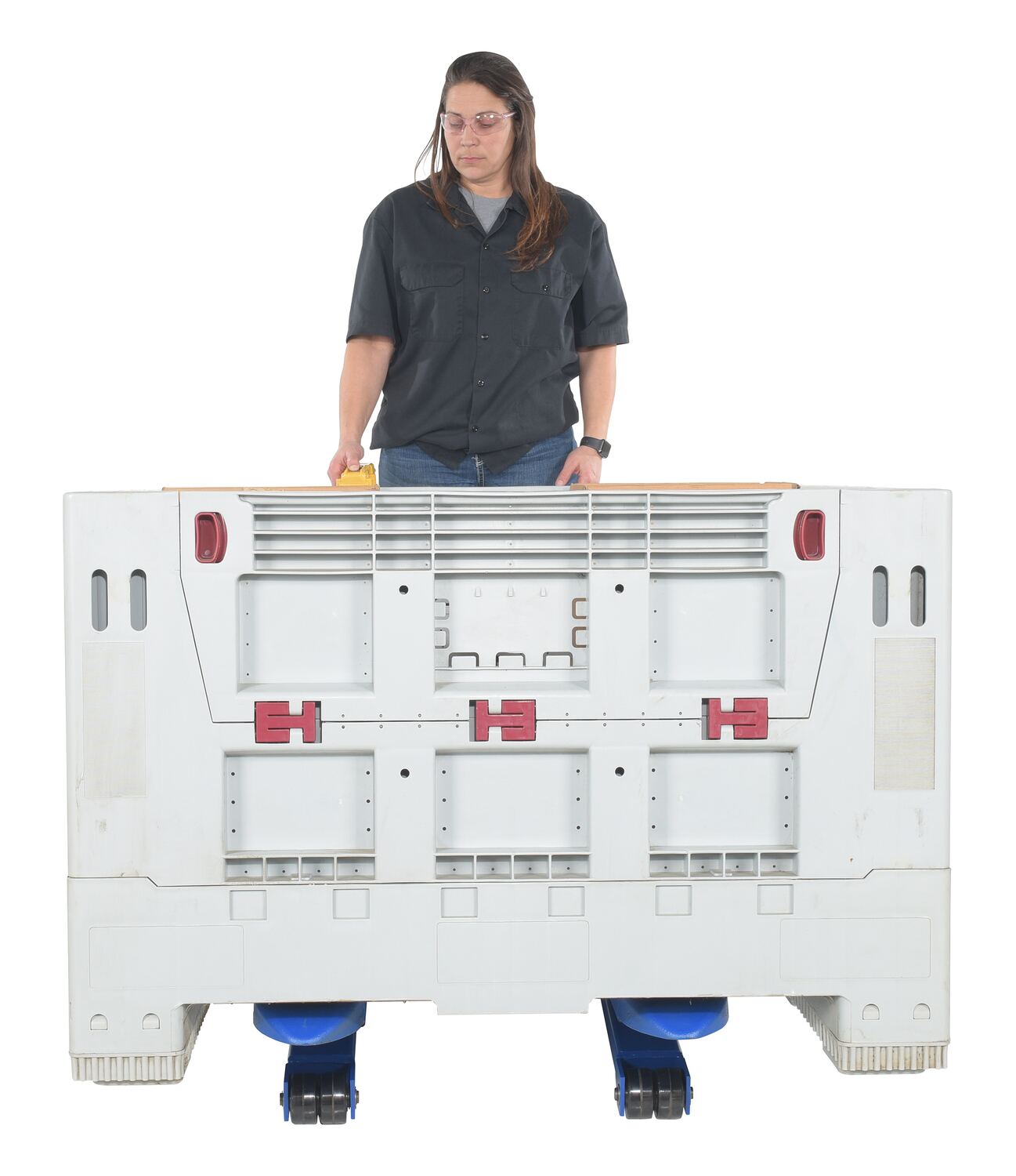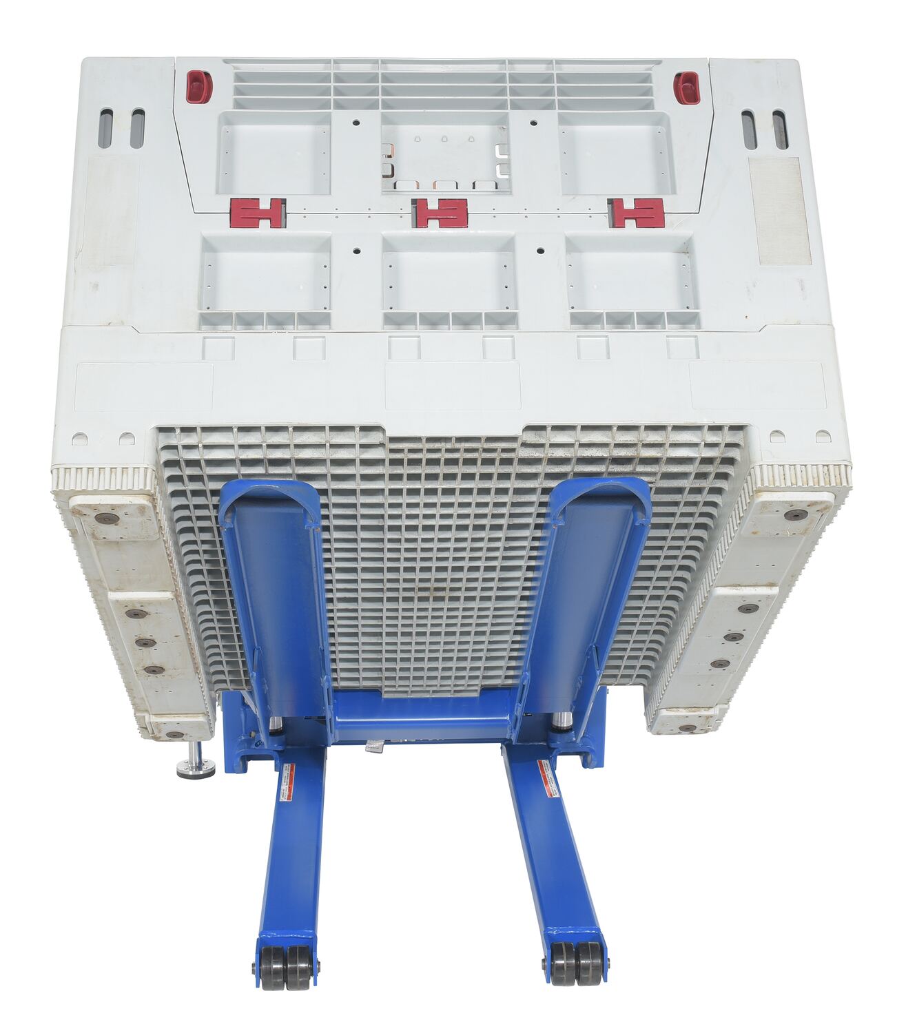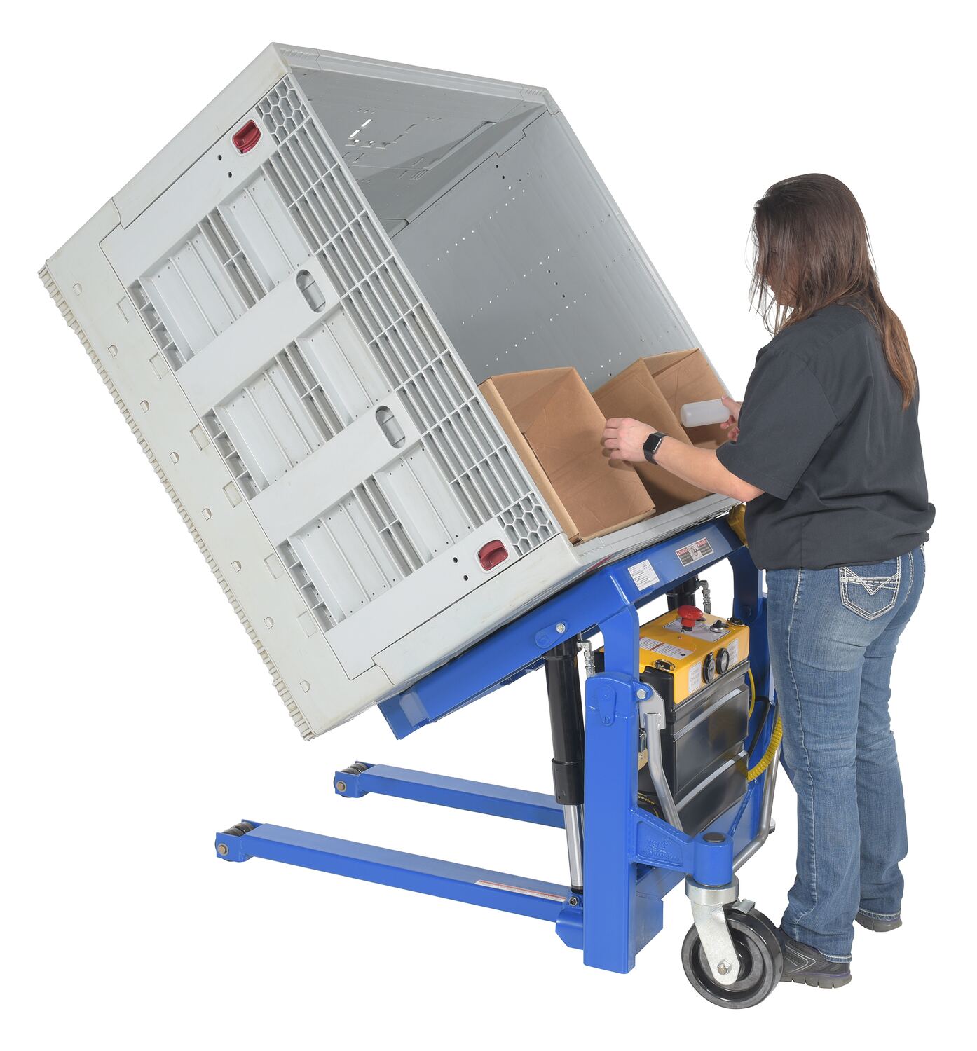 The tilt master lifts and positions filled tote boxes or baskets. It also functions as a transporter, by moving completed products from work station to work station without waiting for a fork truck. This lift has a thin profile to allow the user to get as close to the load as possible, a standard floor lock and rolls easily on the phenolic steering wheels. It is designed to be used with open bottom pallets or skids. The unit is powered by an electric DC motor that includes an on-board battery charger and battery charge indicator.