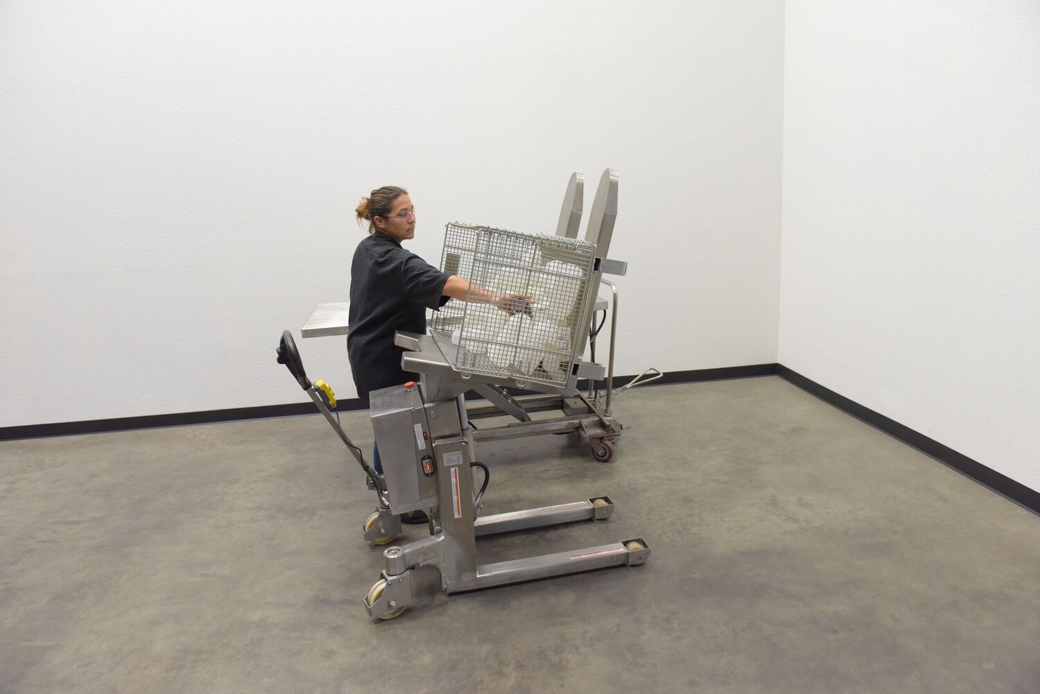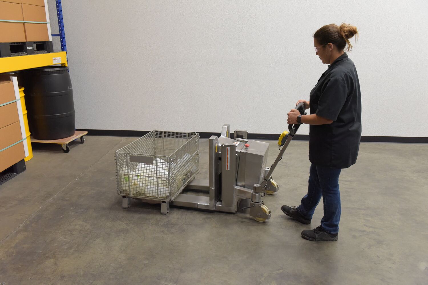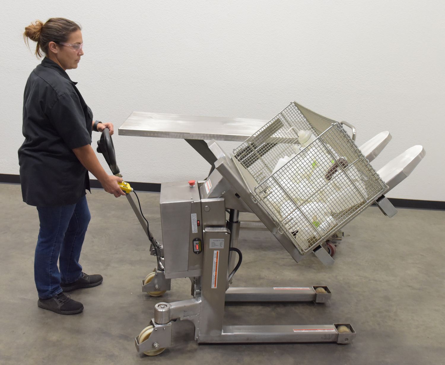 This DC powered tilt master is the perfect upgrade to the always reliable classic. The battery operated electric lifter and tilter is designed to give the user an ergonomically correct position to reach loads easily without the need for bending down or excessively reaching over. Lift, tilt, and transport crates, boxes, and pallets with an open bottom. rolls smoothly on nylon swivel casters with brake and foot protectors. Handle can be turned and locked in position away from the work area. The many amenities include a standard hand control for the tilt, an emergency on/off switch and an external battery charger. The stainless steel construction provides strength and durability throughout a lifetime of daily use.
